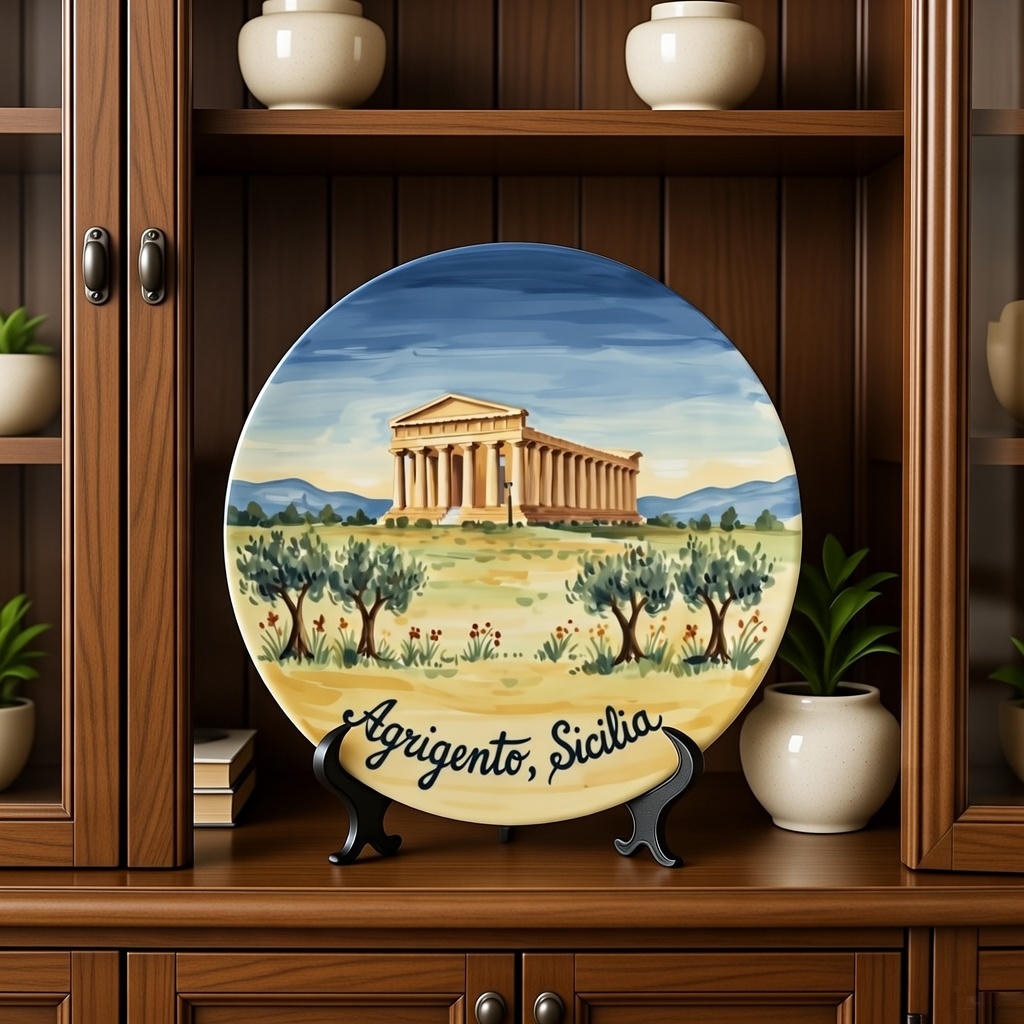 Bring the timeless beauty of the Mediterranean into your home with this stunning decorative plate featuring the iconic Valley of the Temples in Agrigento, Sicily. The artwork captures the majestic Temple of Concordia set against a serene backdrop of ancient olive groves and rolling Sicilian hills. This piece serves as a perfect memento for those who have wandered the historic paths of Italy or dream of visiting the Mediterranean coast. It is designed to be a focal point on any shelf, mantel, or display cabinet, evoking the warm, golden light of a Sicilian sunset.