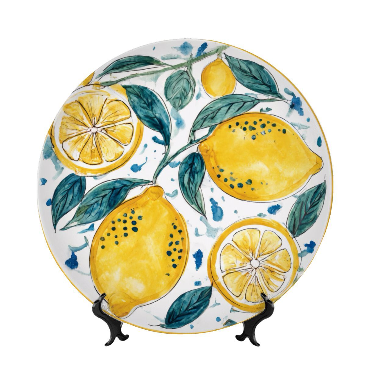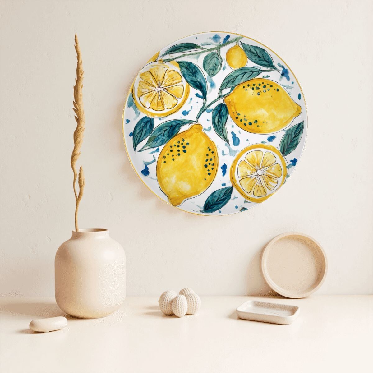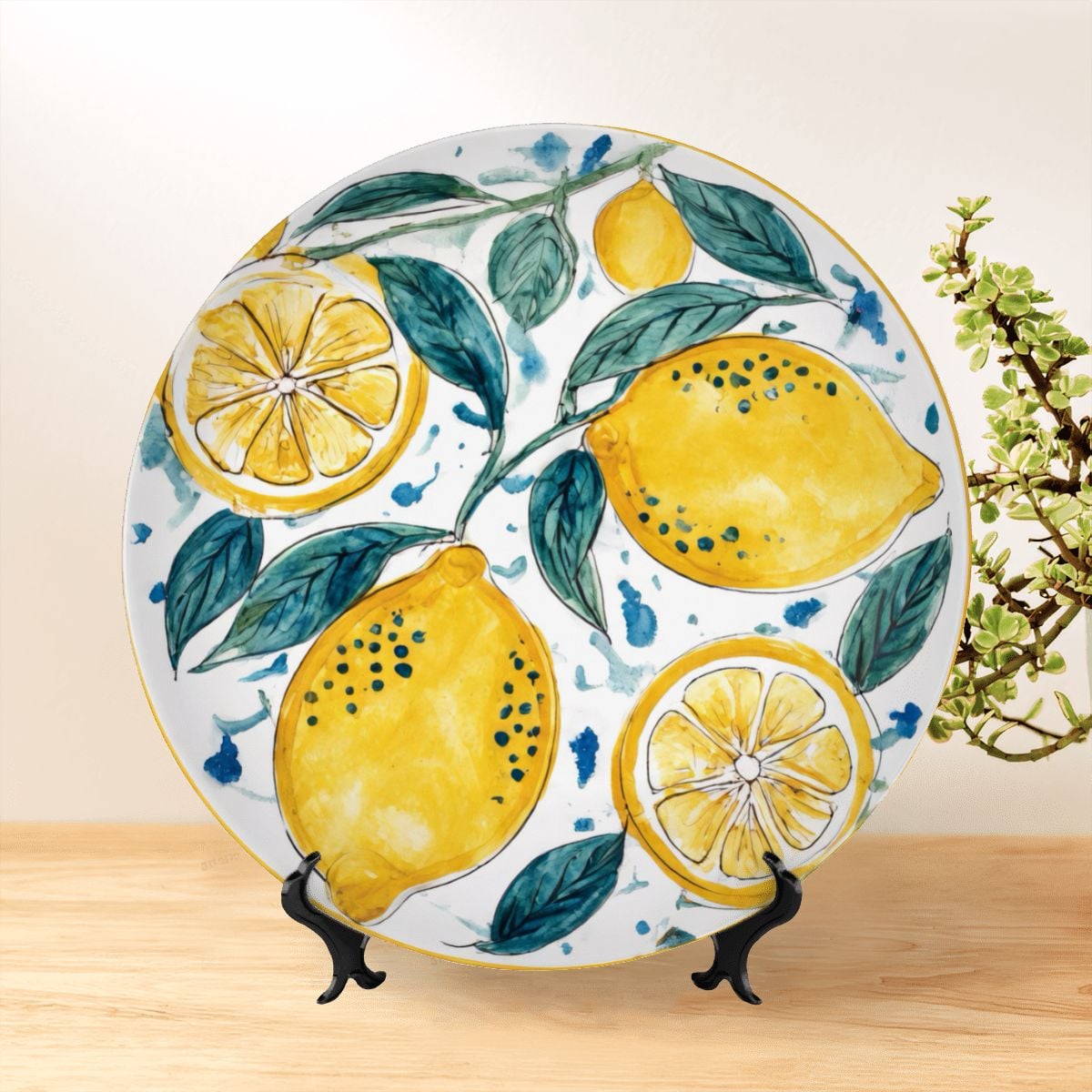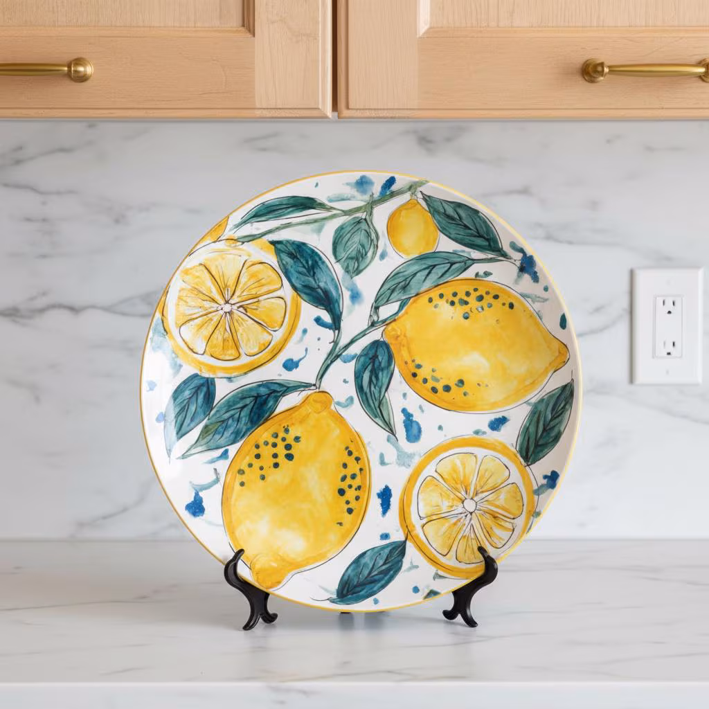 Ceramic Kitchen Display Plate: Lemon Fruit & Splatter Art Pattern (With Stand)