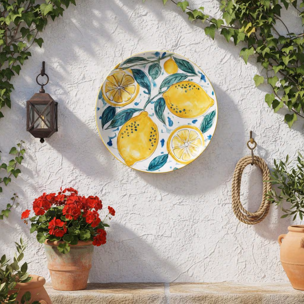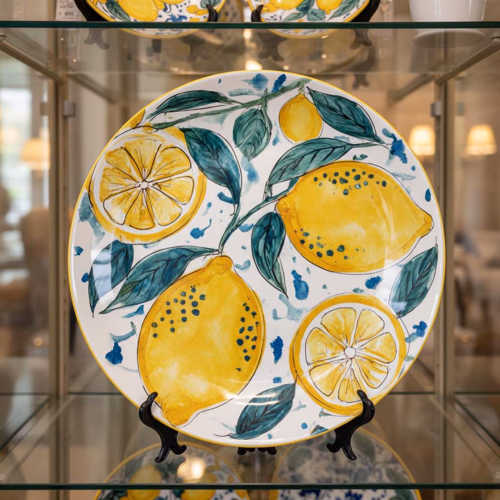 For lovers of fine ceramic art and vibrant citrus motifs, this decorative display plate, with its accompanying stand, is a must-have home accent. Inspired by the beautiful tilework and artistry found along the Italian coast (Costiera), this ceramic plate features a compelling arrangement of whole lemons, large lemon slices, and detailed leaves, all set with artistic blue paint splatter accents. Display it prominently in your home to add a touch of fresh, lively style and Italian artisan-inspired charm. (Including Stand).