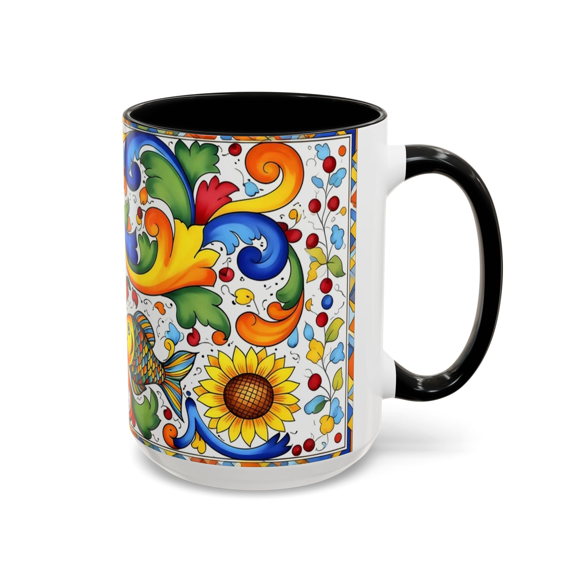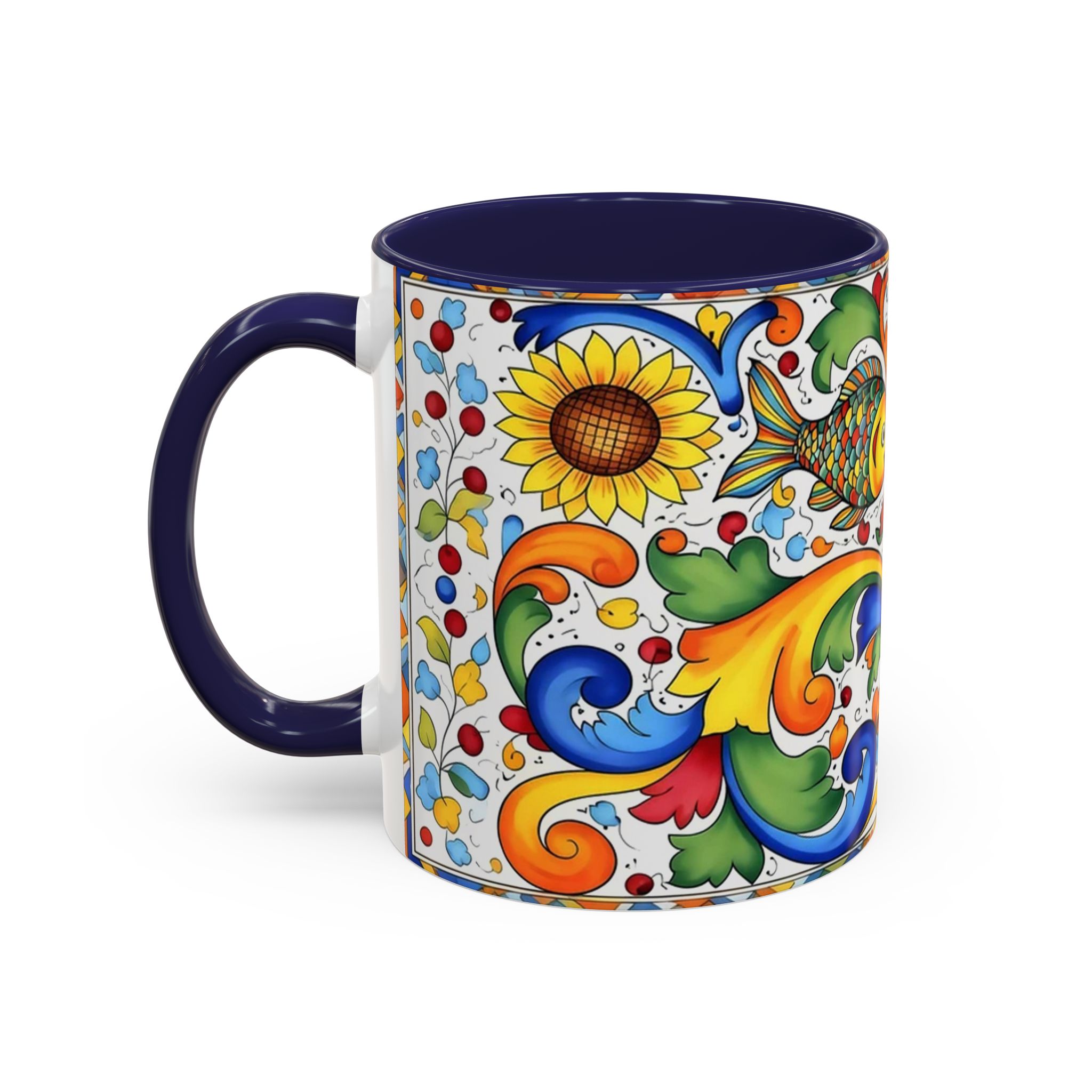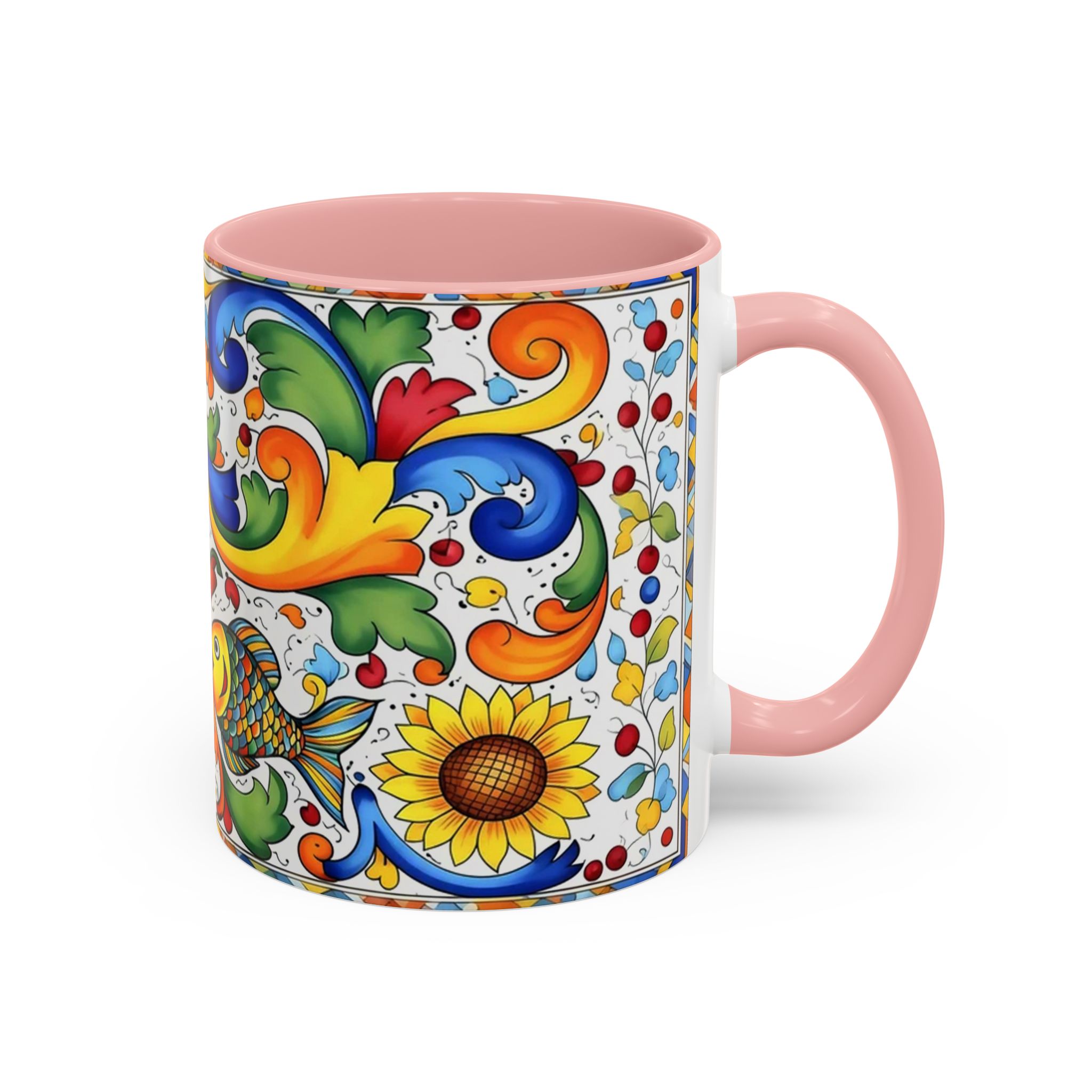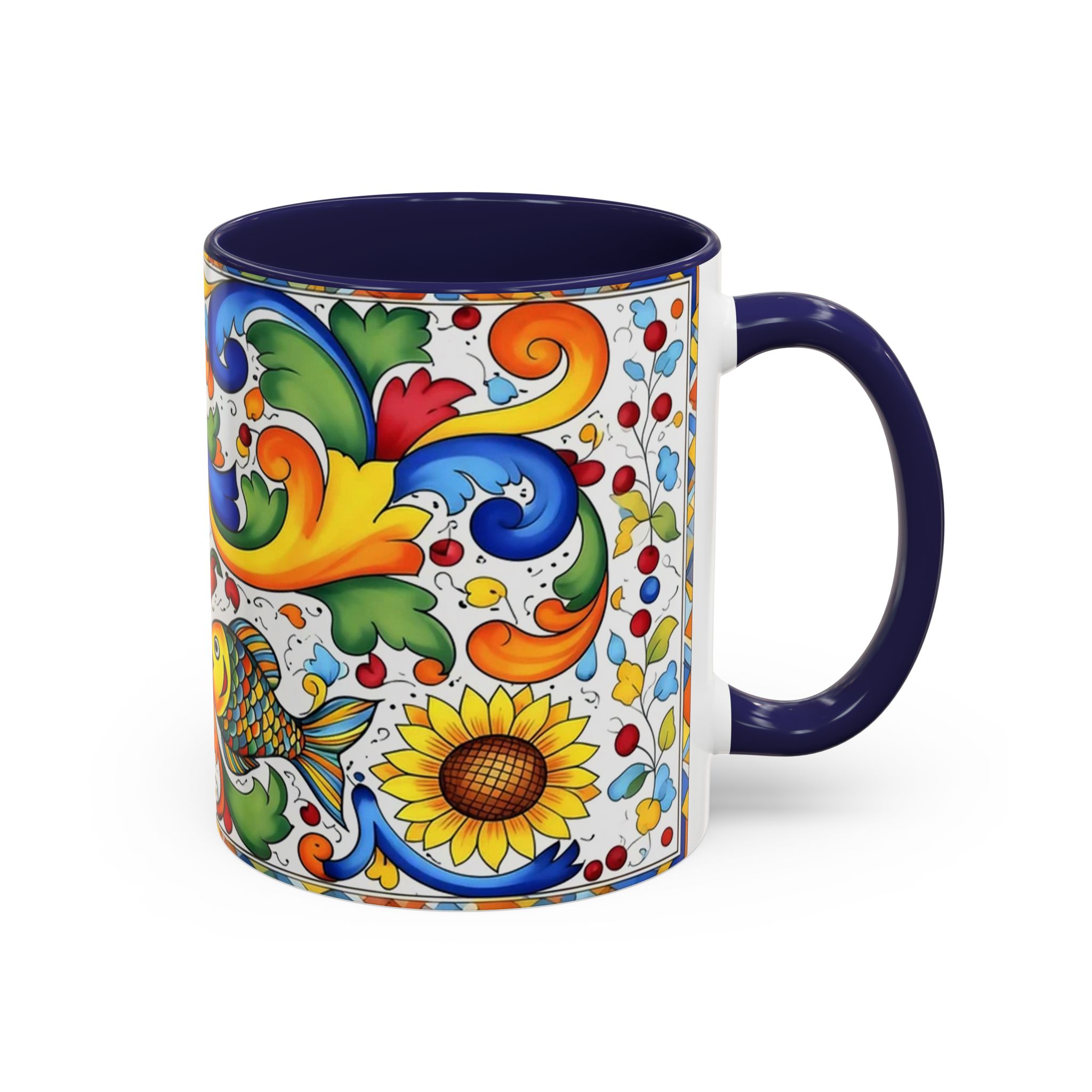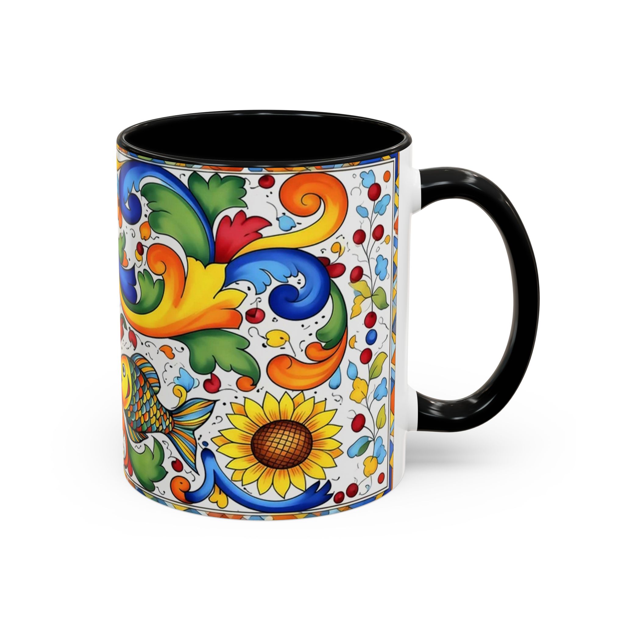 Bright, hand-painted color blooms across this ceramic coffee mug like a little celebration for your morning. The glossy white body contrasts with a colored interior and handle, while playful fish, sunflowers, and swirling baroque motifs wrap the mug in joyful motion. Hold it up and you’ll feel a splash of Mediterranean sunshine—warm, lively, and a touch whimsical. It slips easily into everyday routines: a quiet kitchen at dawn, a desk-side pick-me-up, or a slow weekend with a good playlist. The sturdy C-handle and smooth finish make each sip comfortable; the vibrant print keeps its cheer through regular use and washing. For anyone who loves color, pattern, and a daily reminder to savor small pleasures, this mug brings personality to every cup.