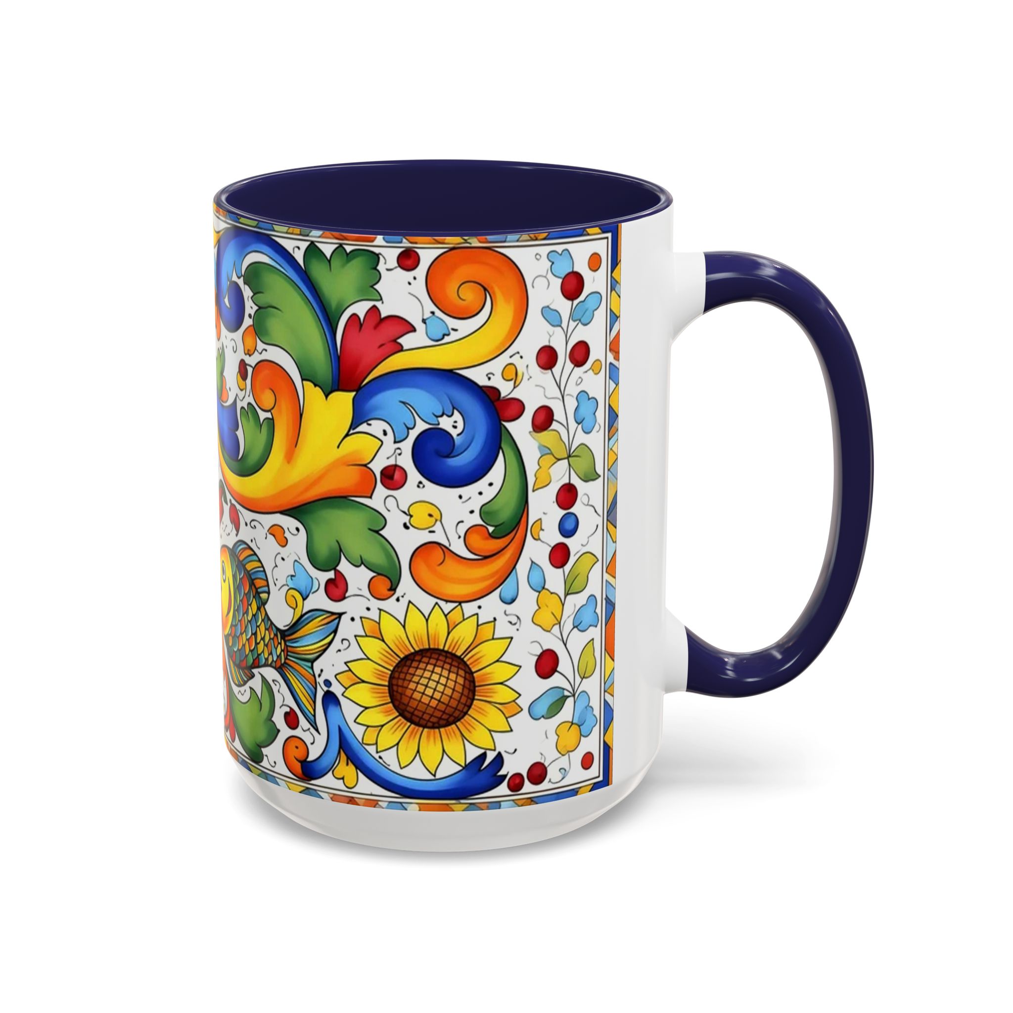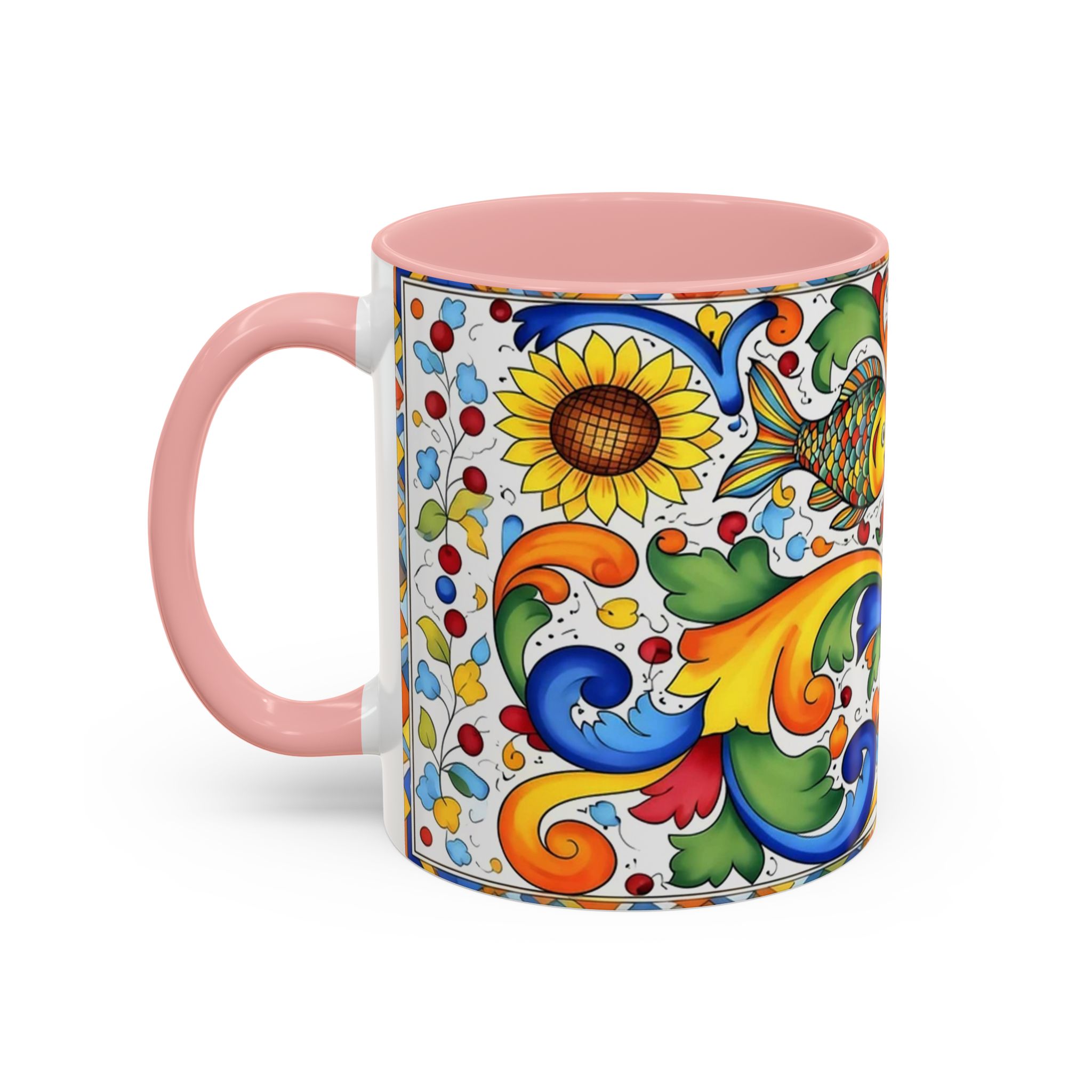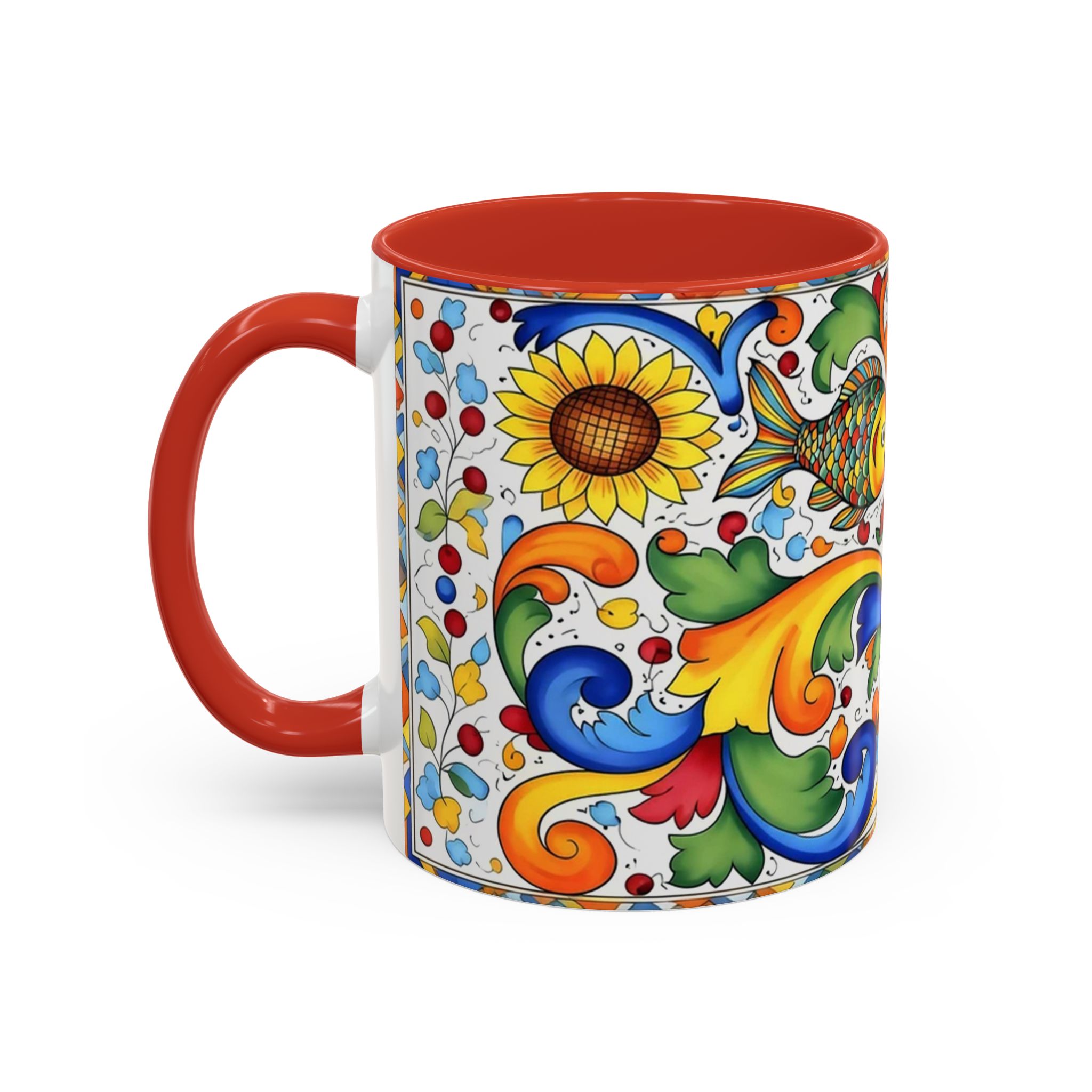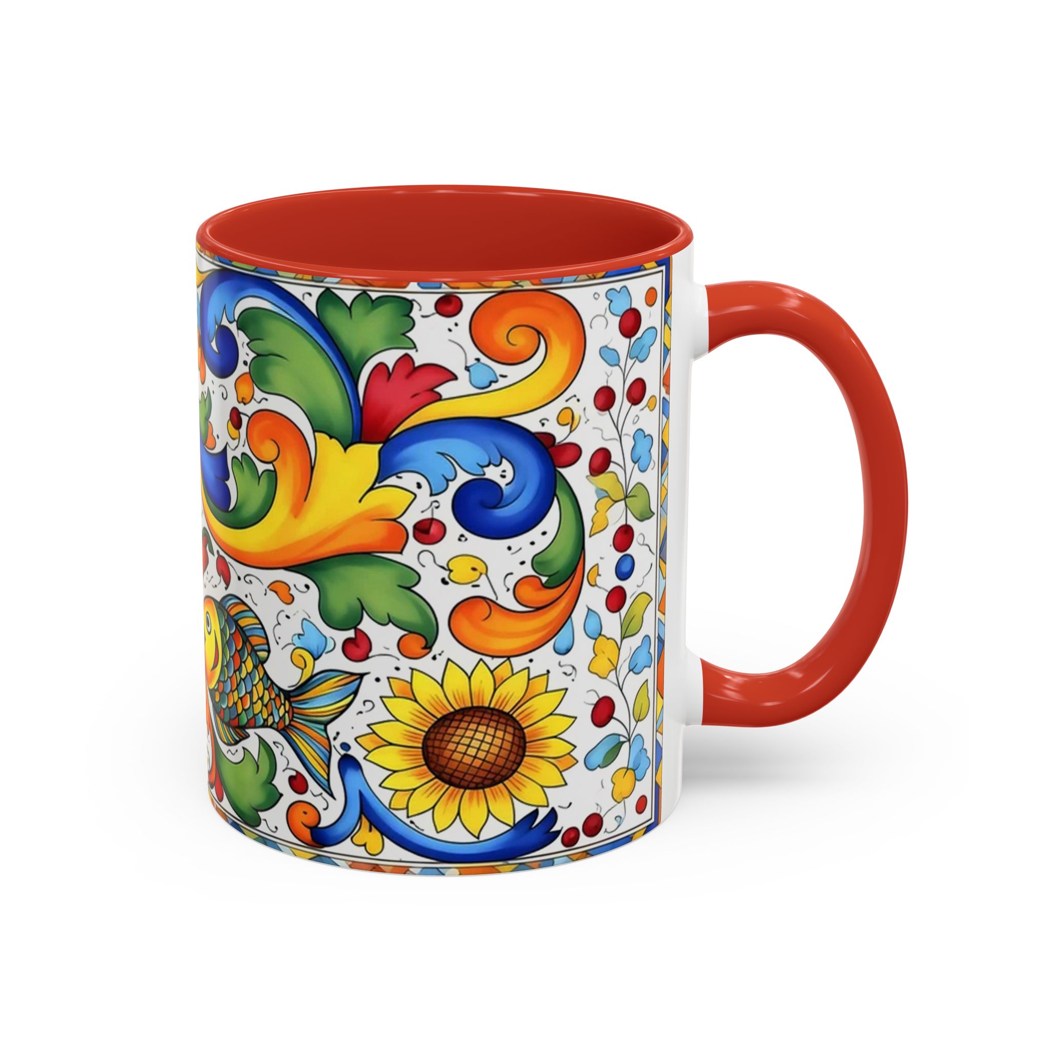 Bright, hand-painted color blooms across this ceramic coffee mug like a little celebration for your morning. The glossy white body contrasts with a colored interior and handle, while playful fish, sunflowers, and swirling baroque motifs wrap the mug in joyful motion. Hold it up and you’ll feel a splash of Mediterranean sunshine—warm, lively, and a touch whimsical. It slips easily into everyday routines: a quiet kitchen at dawn, a desk-side pick-me-up, or a slow weekend with a good playlist. The sturdy C-handle and smooth finish make each sip comfortable; the vibrant print keeps its cheer through regular use and washing. For anyone who loves color, pattern, and a daily reminder to savor small pleasures, this mug brings personality to every cup.