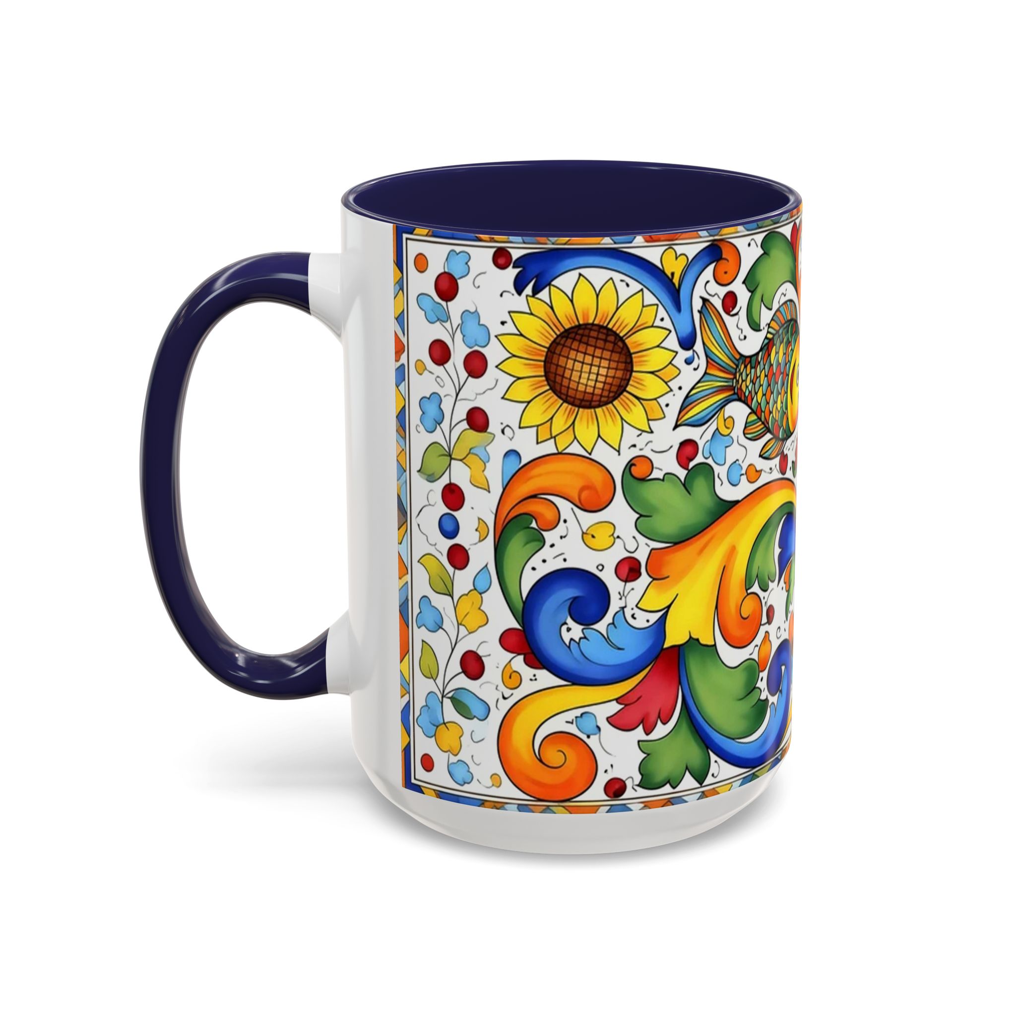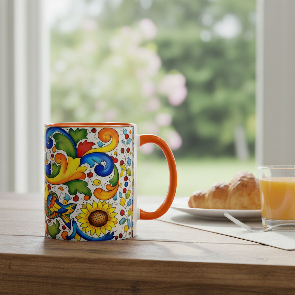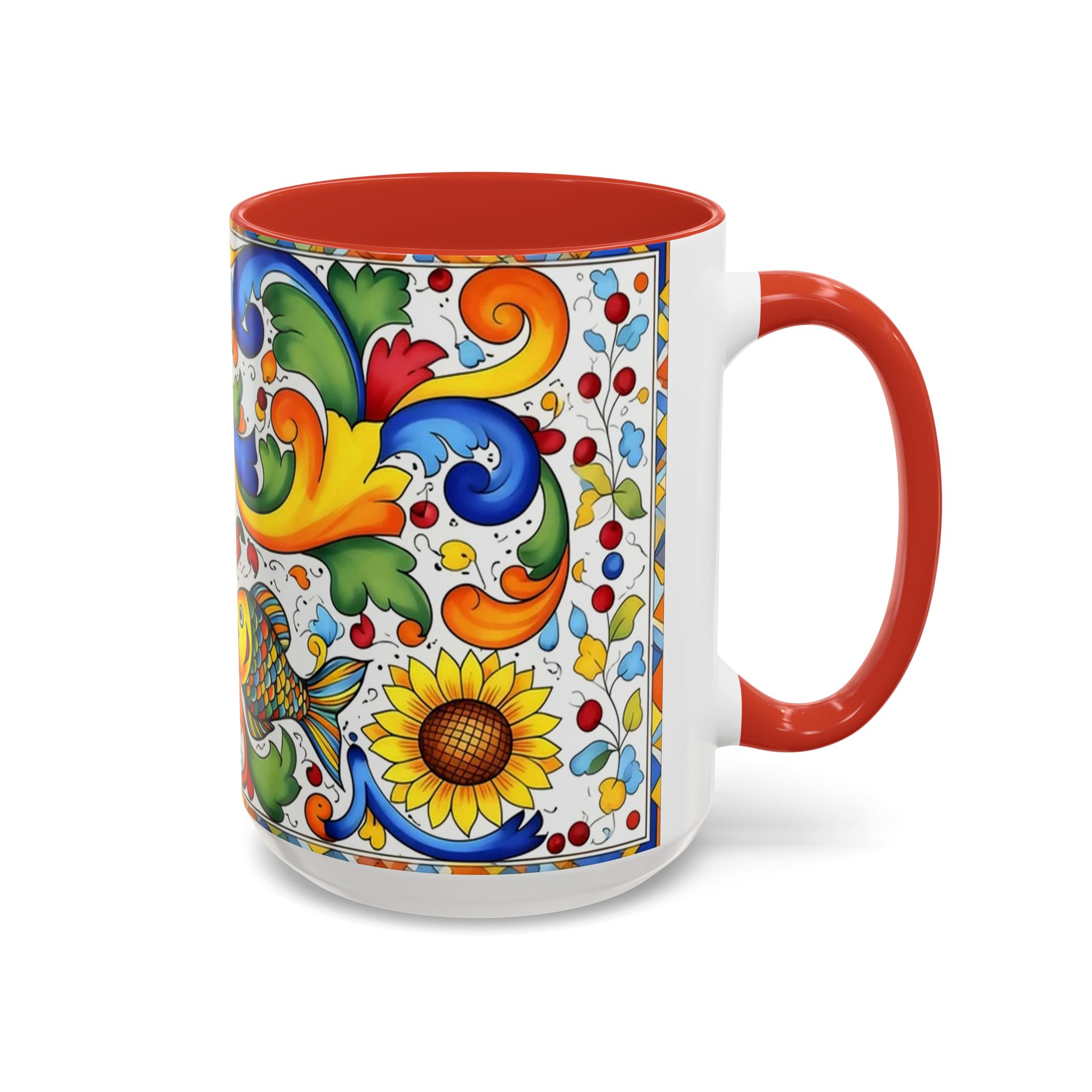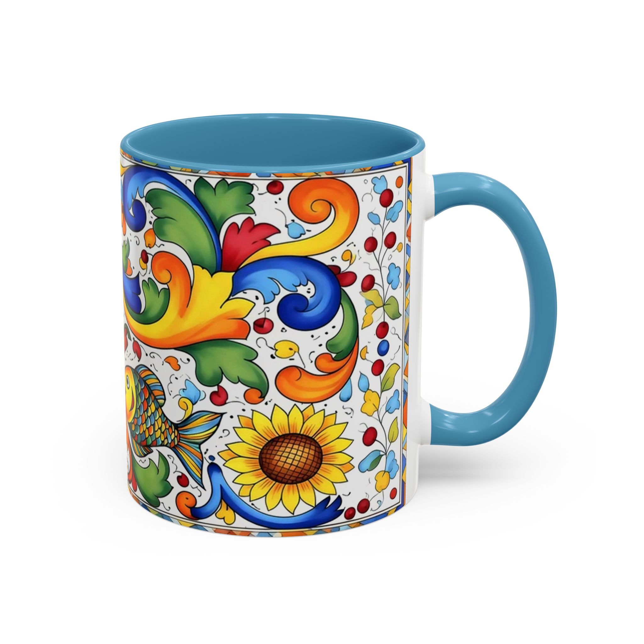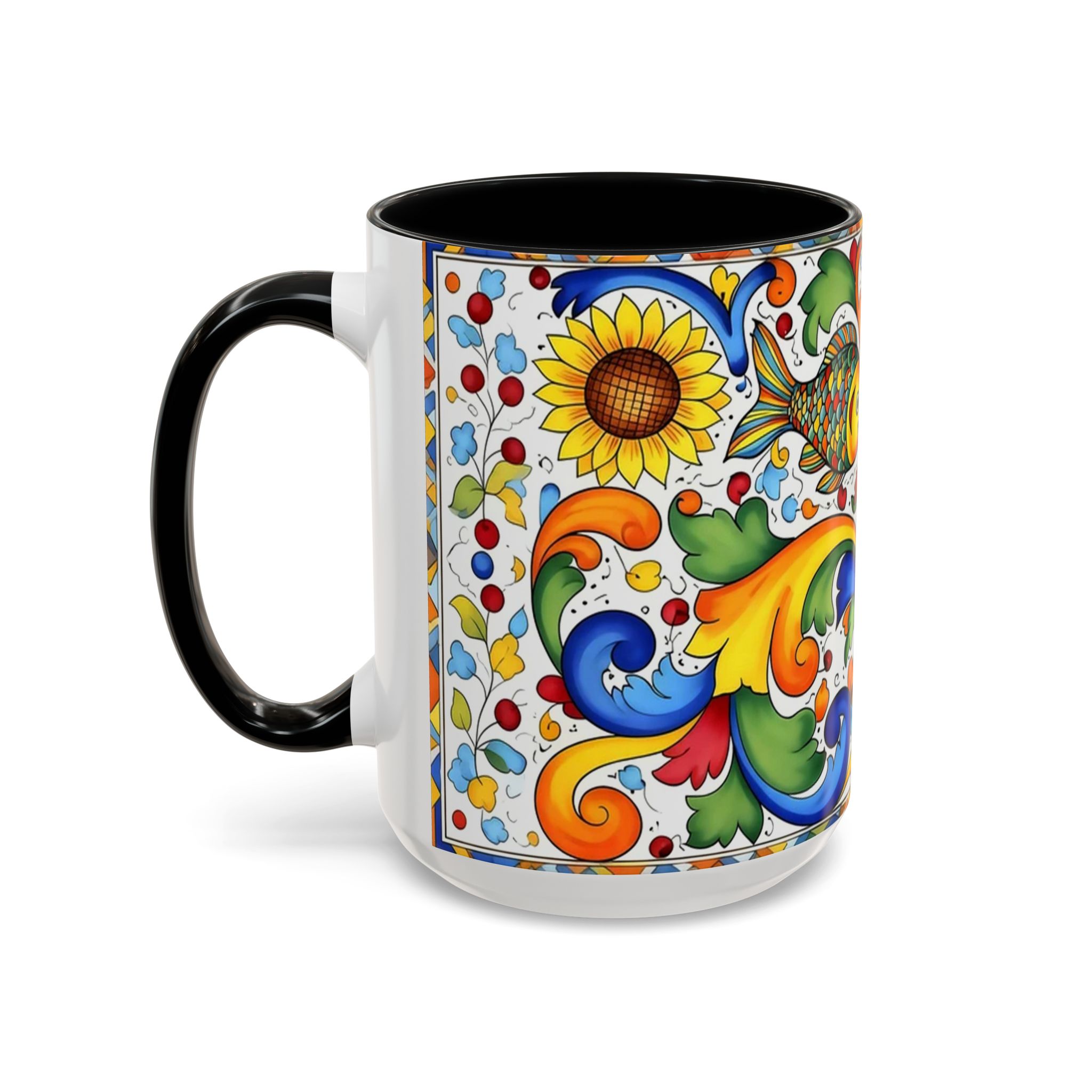 Bright, hand-painted color blooms across this ceramic coffee mug like a little celebration for your morning. The glossy white body contrasts with a colored interior and handle, while playful fish, sunflowers, and swirling baroque motifs wrap the mug in joyful motion. Hold it up and you’ll feel a splash of Mediterranean sunshine—warm, lively, and a touch whimsical. It slips easily into everyday routines: a quiet kitchen at dawn, a desk-side pick-me-up, or a slow weekend with a good playlist. The sturdy C-handle and smooth finish make each sip comfortable; the vibrant print keeps its cheer through regular use and washing. For anyone who loves color, pattern, and a daily reminder to savor small pleasures, this mug brings personality to every cup.