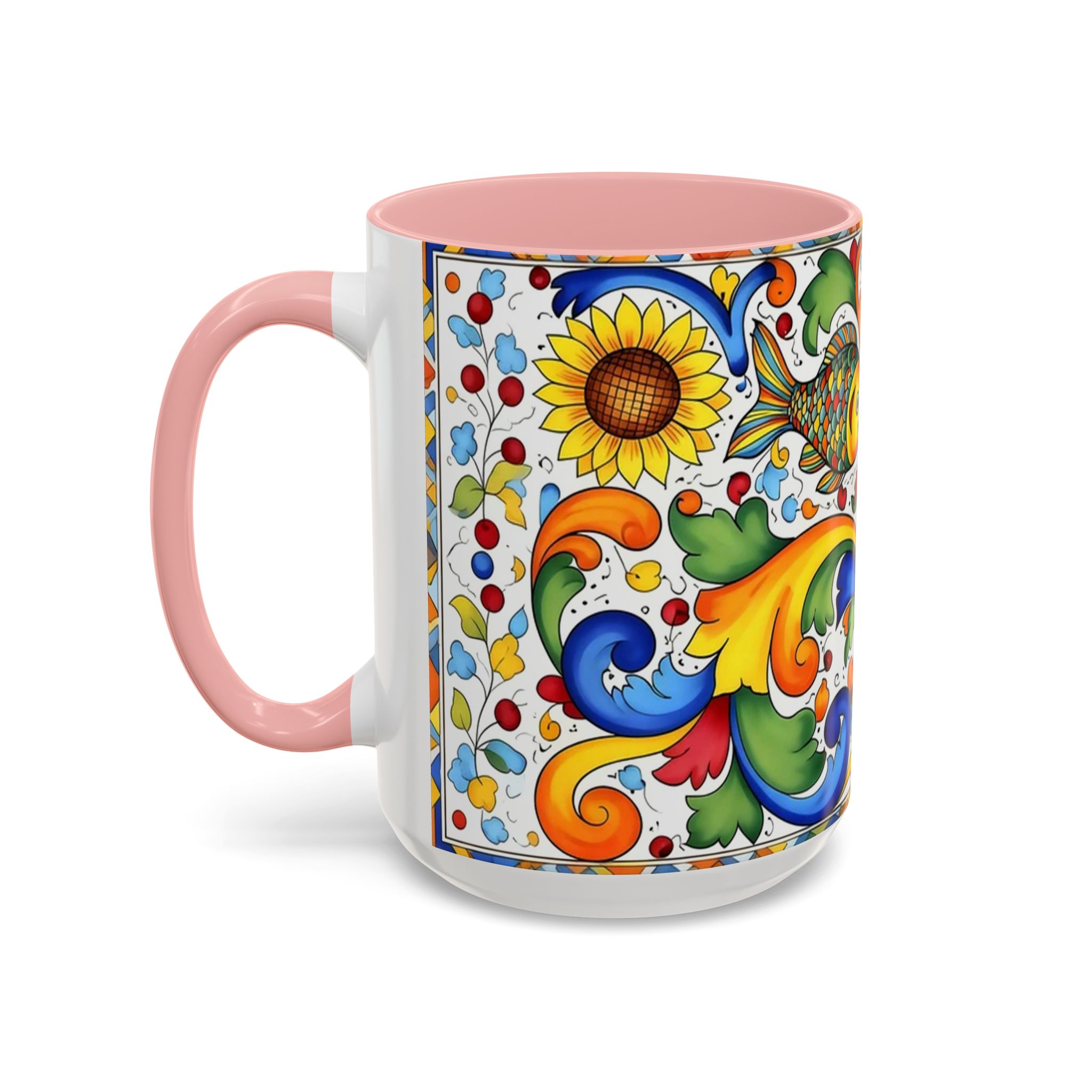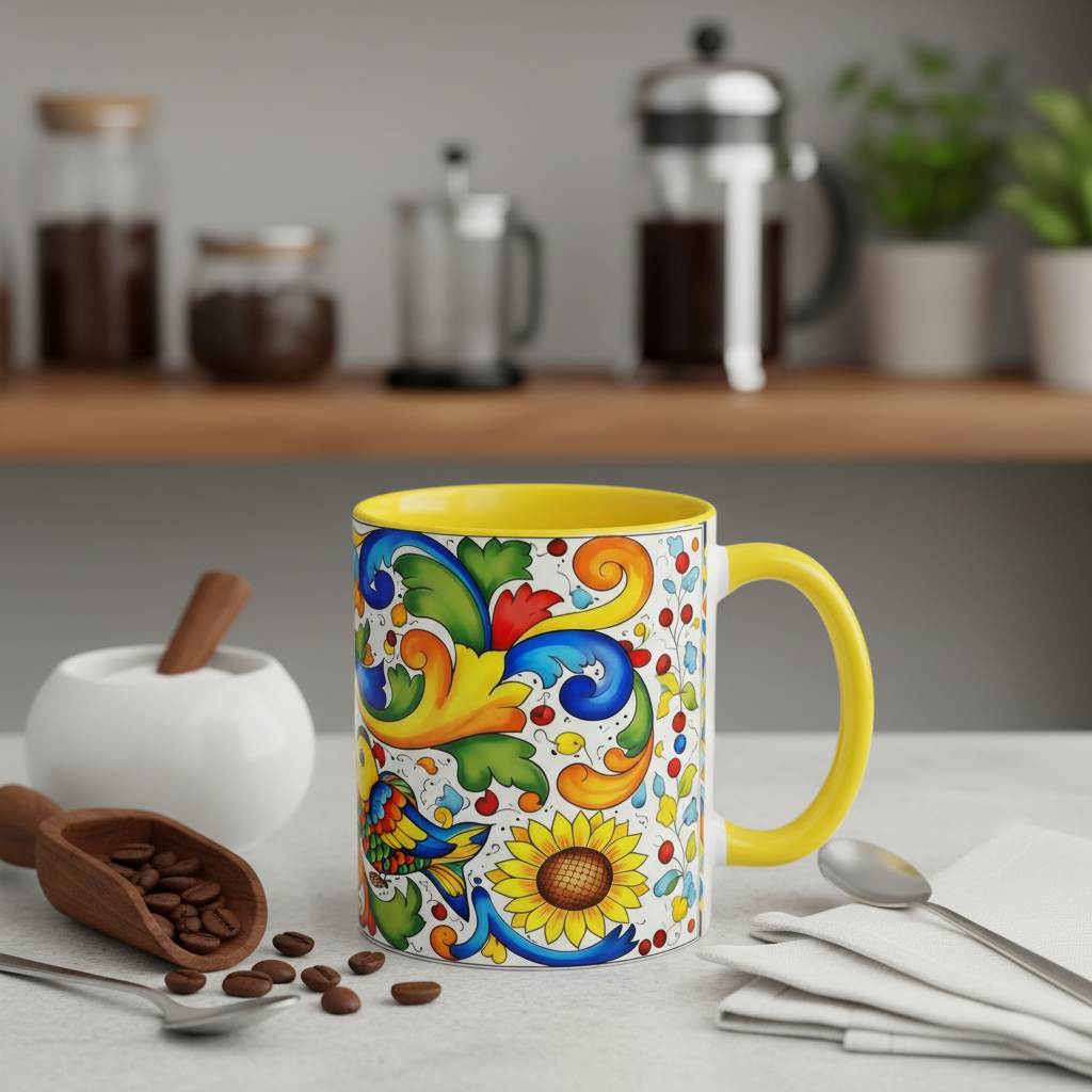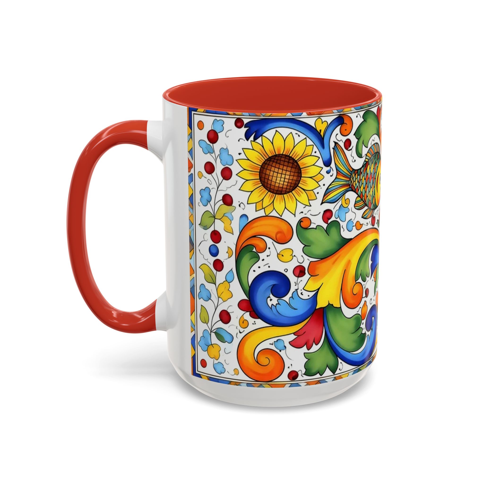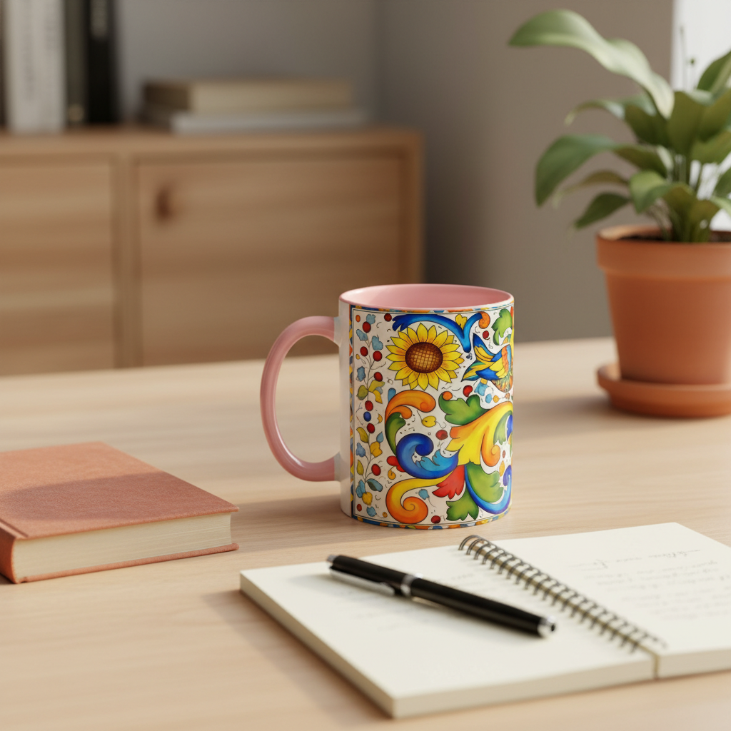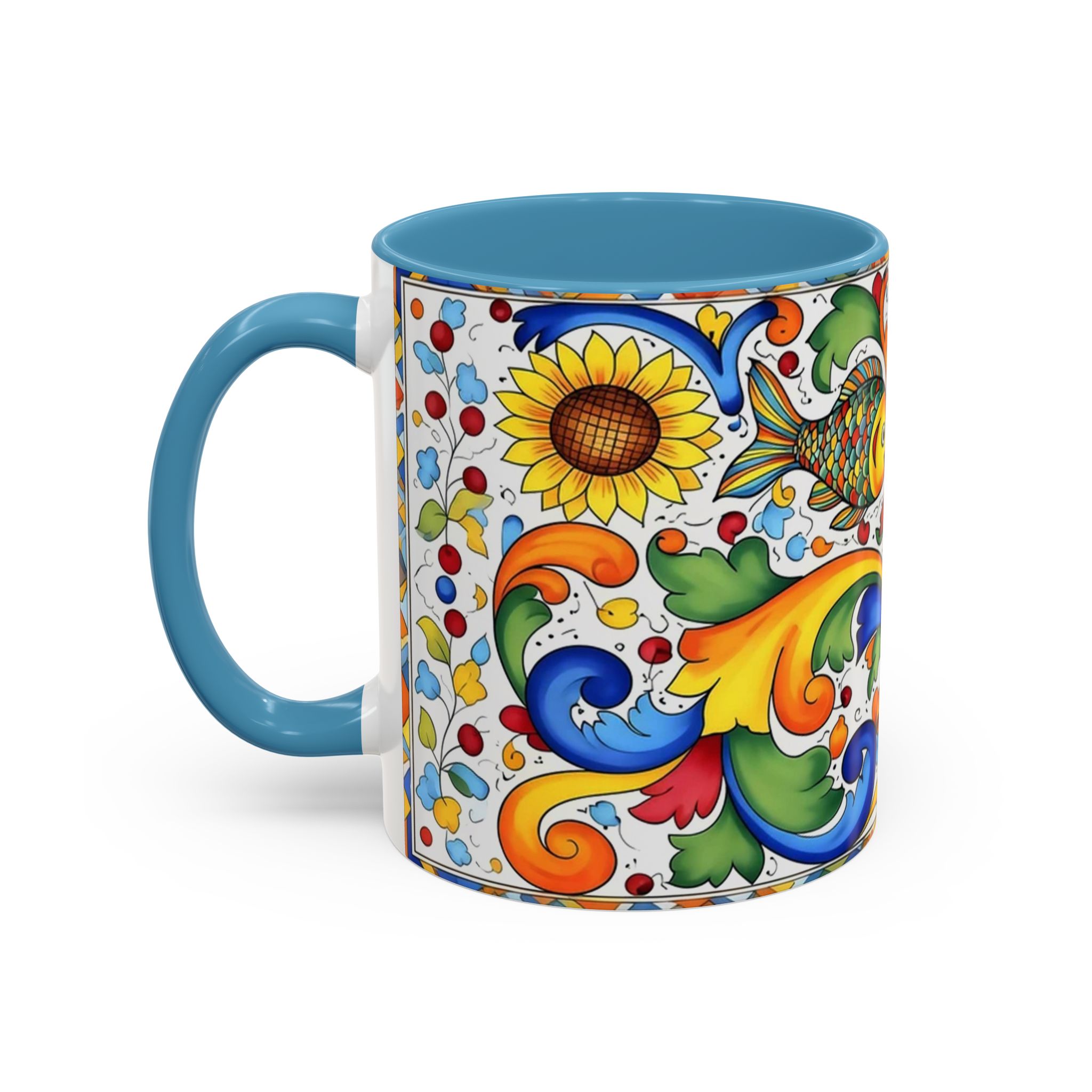 Bright, hand-painted color blooms across this ceramic coffee mug like a little celebration for your morning. The glossy white body contrasts with a colored interior and handle, while playful fish, sunflowers, and swirling baroque motifs wrap the mug in joyful motion. Hold it up and you’ll feel a splash of Mediterranean sunshine—warm, lively, and a touch whimsical. It slips easily into everyday routines: a quiet kitchen at dawn, a desk-side pick-me-up, or a slow weekend with a good playlist. The sturdy C-handle and smooth finish make each sip comfortable; the vibrant print keeps its cheer through regular use and washing. For anyone who loves color, pattern, and a daily reminder to savor small pleasures, this mug brings personality to every cup.