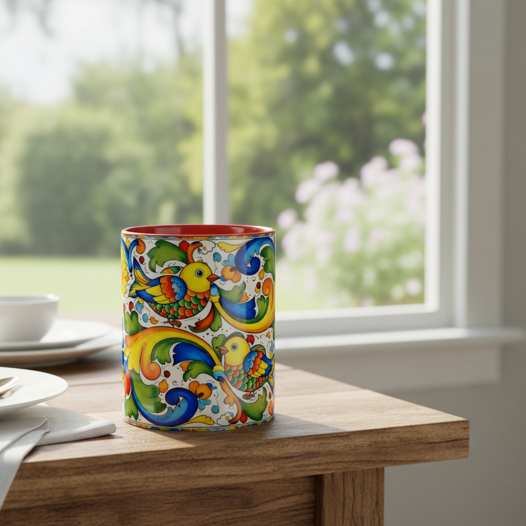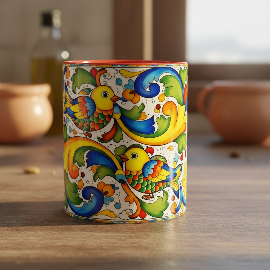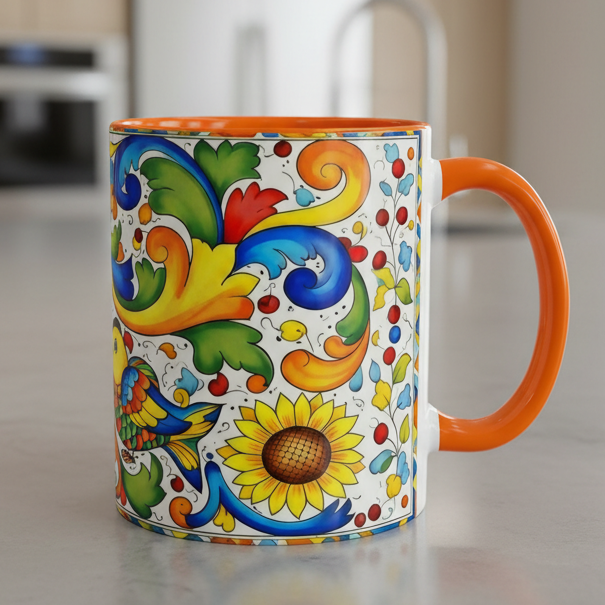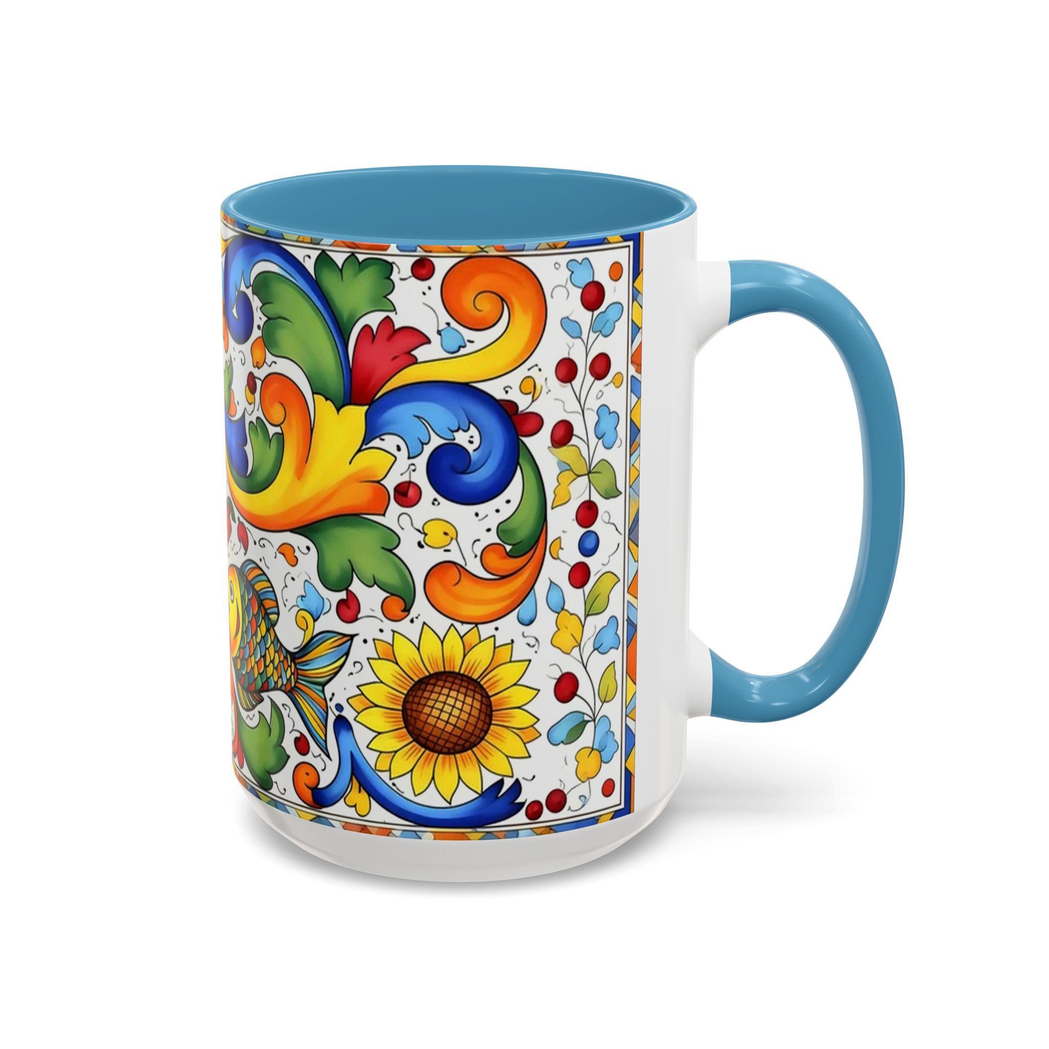 Bright, hand-painted color blooms across this ceramic coffee mug like a little celebration for your morning. The glossy white body contrasts with a colored interior and handle, while playful fish, sunflowers, and swirling baroque motifs wrap the mug in joyful motion. Hold it up and you’ll feel a splash of Mediterranean sunshine—warm, lively, and a touch whimsical. It slips easily into everyday routines: a quiet kitchen at dawn, a desk-side pick-me-up, or a slow weekend with a good playlist. The sturdy C-handle and smooth finish make each sip comfortable; the vibrant print keeps its cheer through regular use and washing. For anyone who loves color, pattern, and a daily reminder to savor small pleasures, this mug brings personality to every cup.