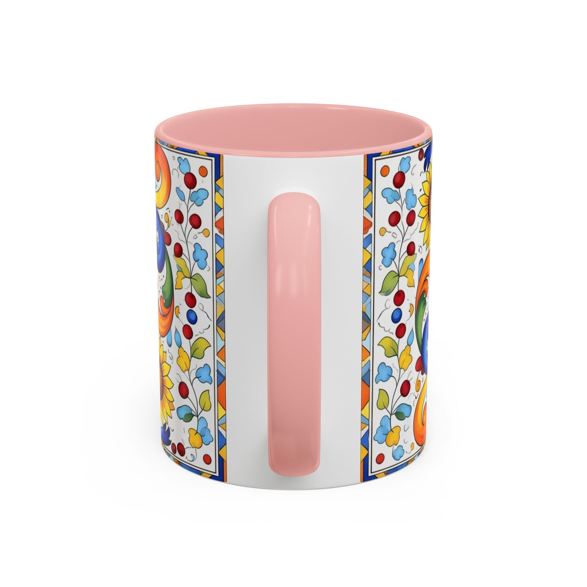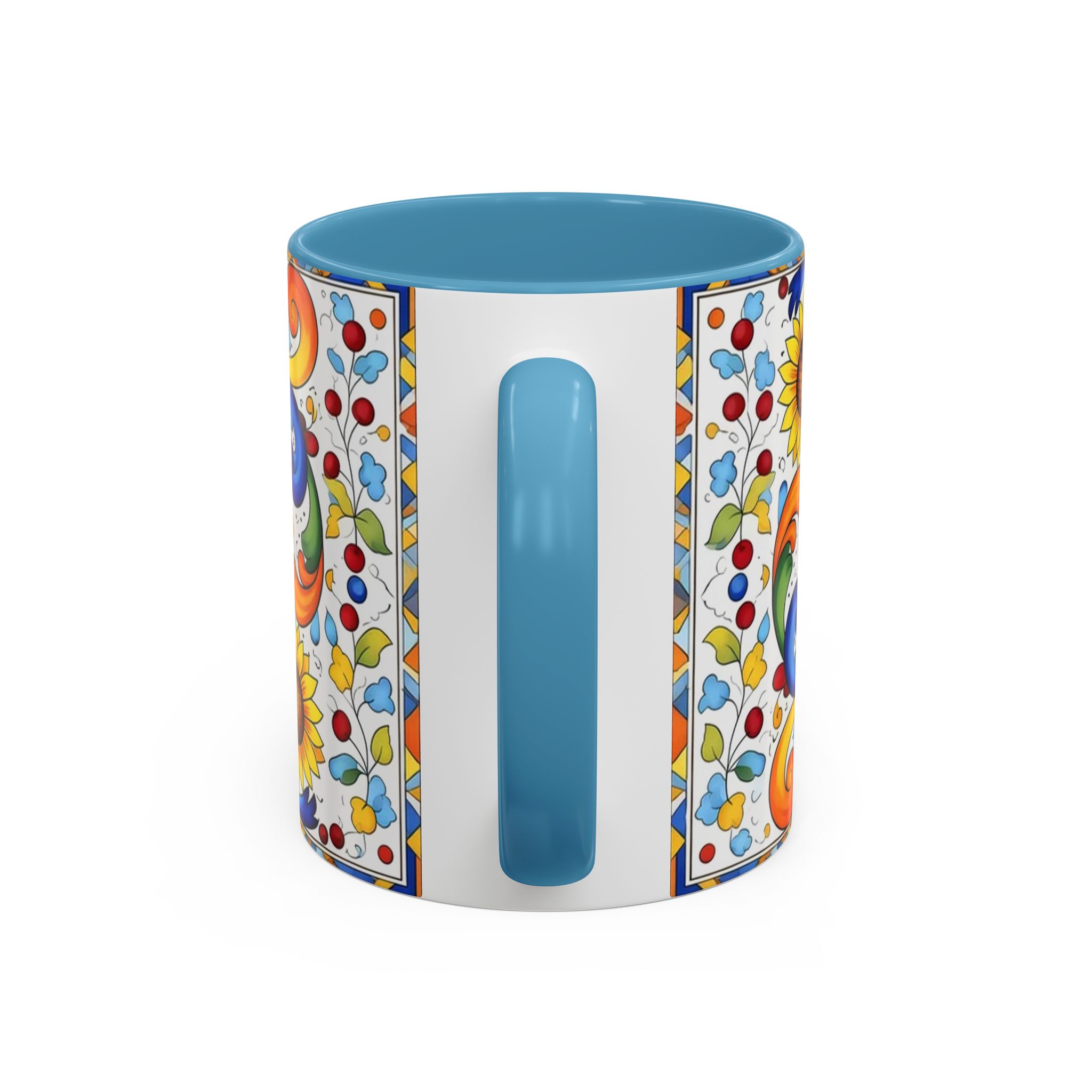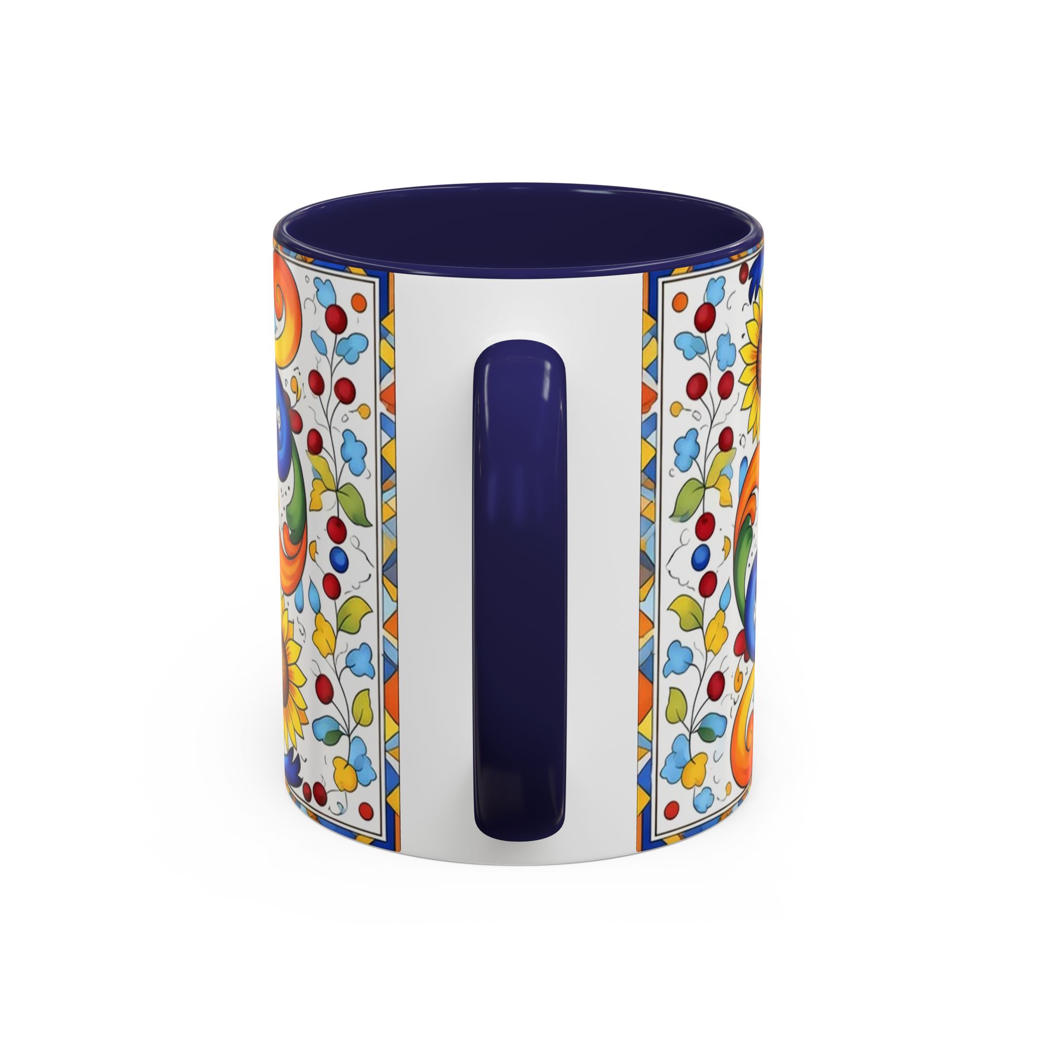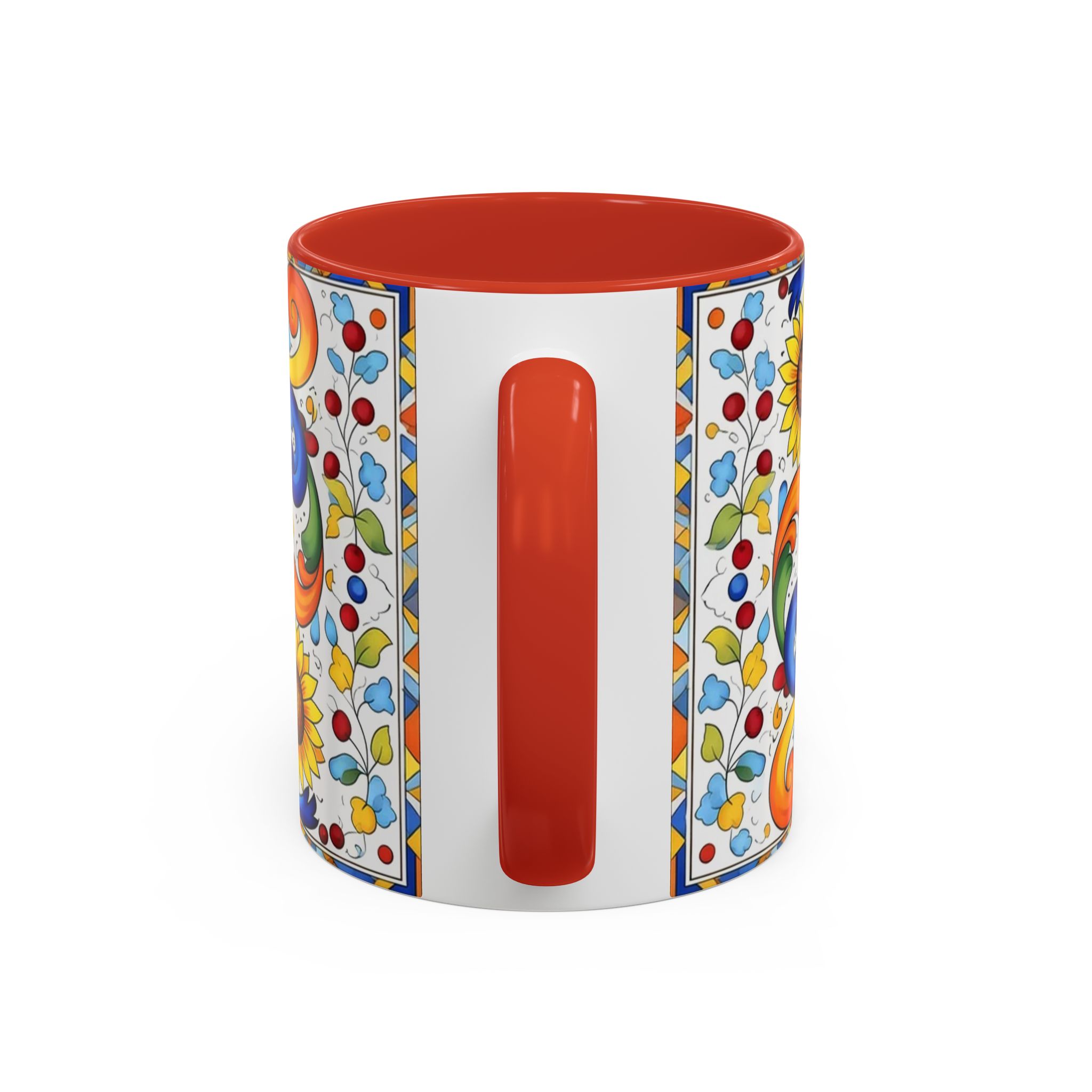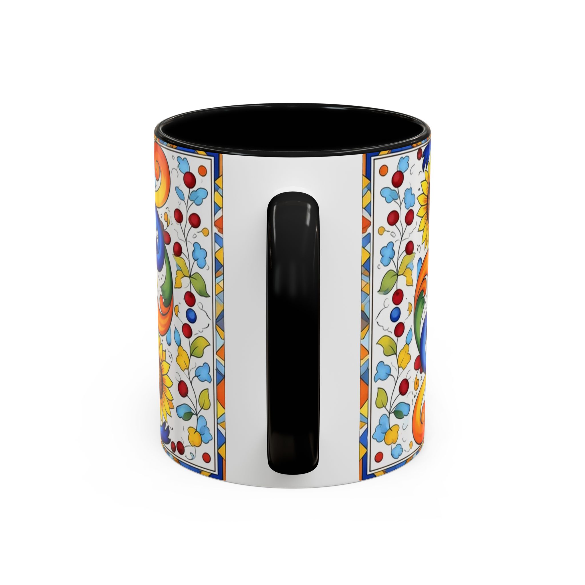 Bright, hand-painted color blooms across this ceramic coffee mug like a little celebration for your morning. The glossy white body contrasts with a colored interior and handle, while playful fish, sunflowers, and swirling baroque motifs wrap the mug in joyful motion. Hold it up and you’ll feel a splash of Mediterranean sunshine—warm, lively, and a touch whimsical. It slips easily into everyday routines: a quiet kitchen at dawn, a desk-side pick-me-up, or a slow weekend with a good playlist. The sturdy C-handle and smooth finish make each sip comfortable; the vibrant print keeps its cheer through regular use and washing. For anyone who loves color, pattern, and a daily reminder to savor small pleasures, this mug brings personality to every cup.