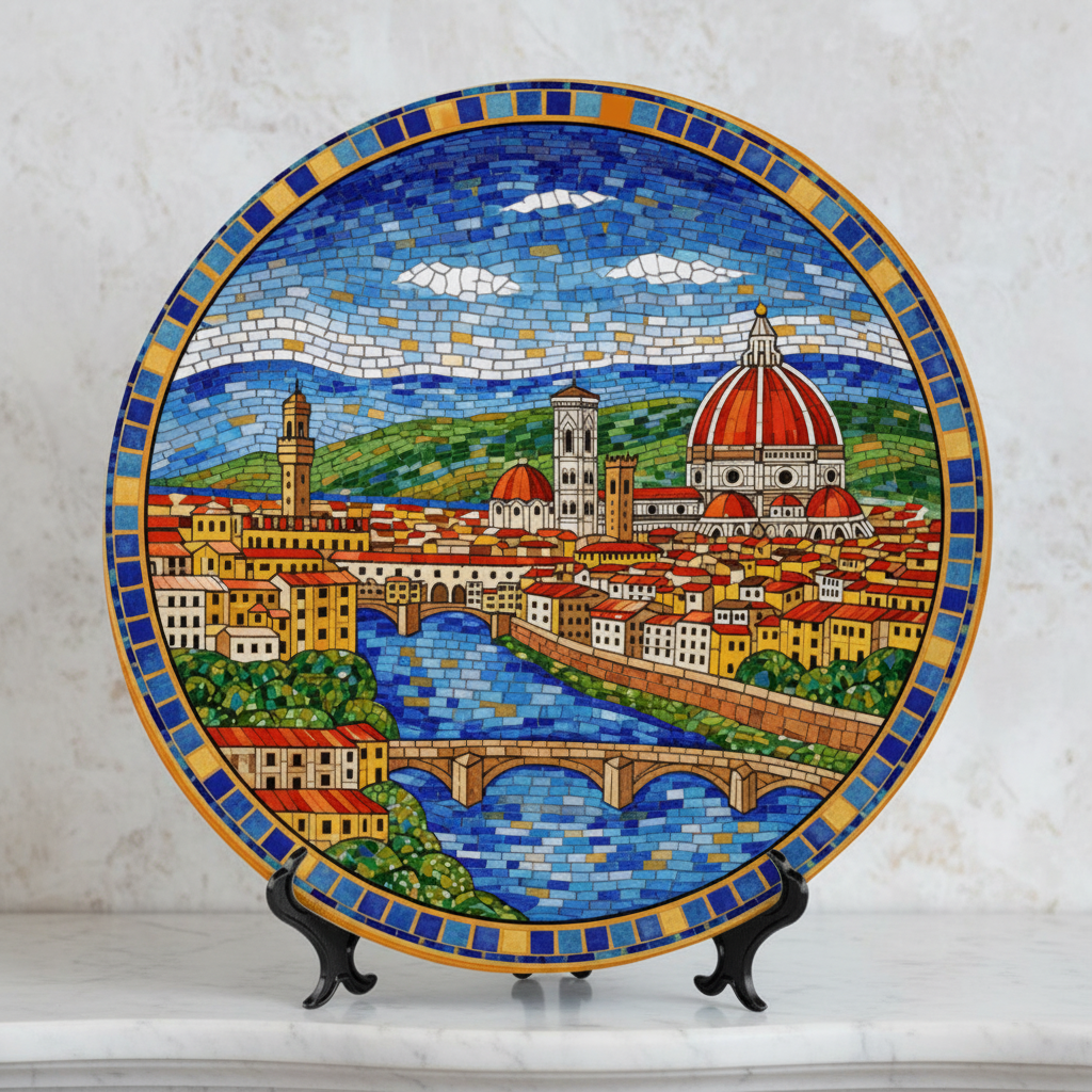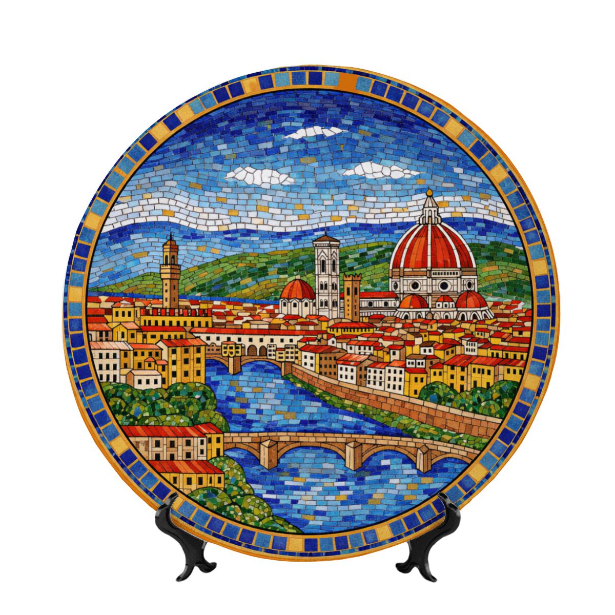 Firenze-Inspired Panoramic City Mosaic Ceramic Plate for Home Decor (Including Stand)