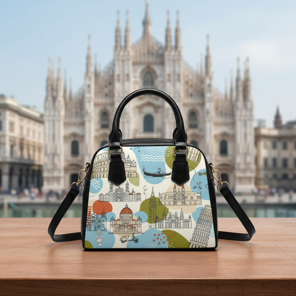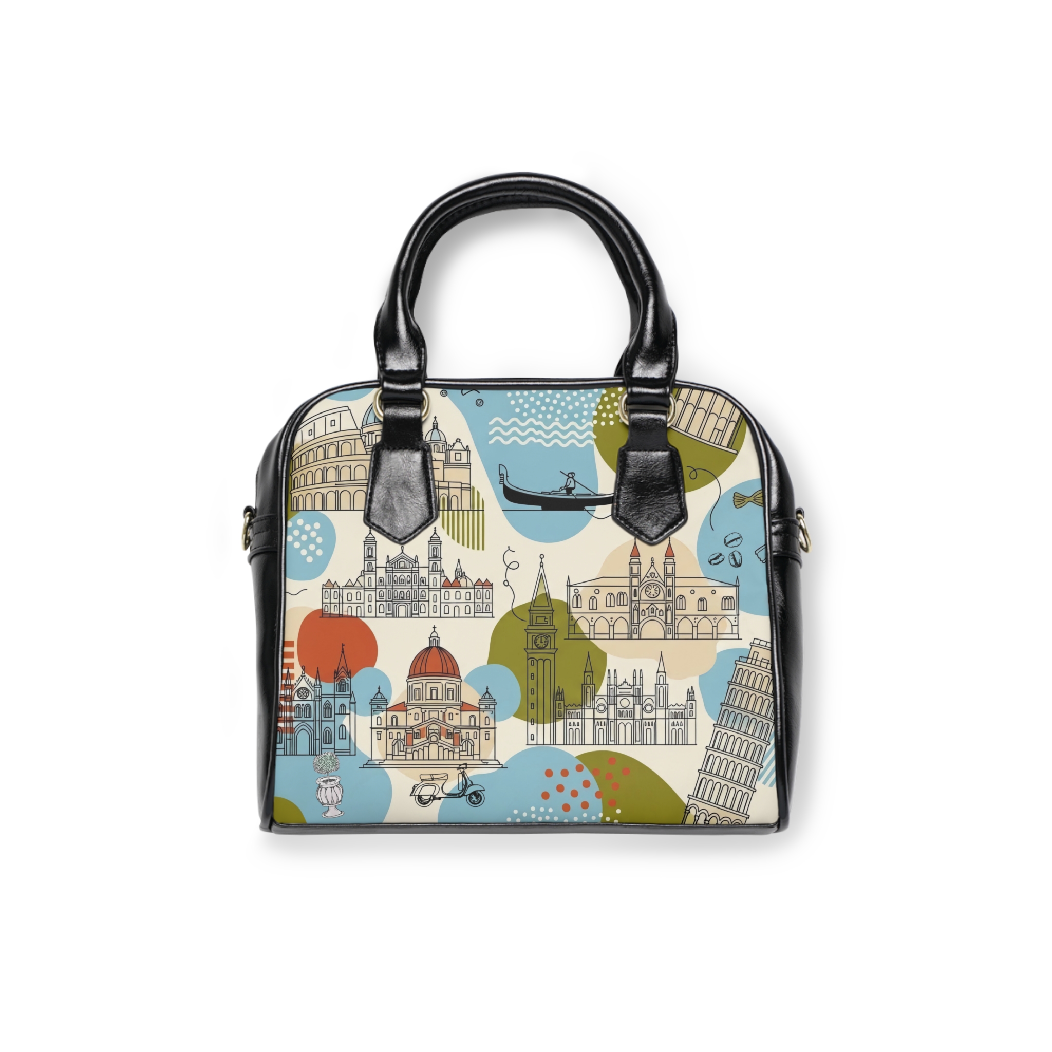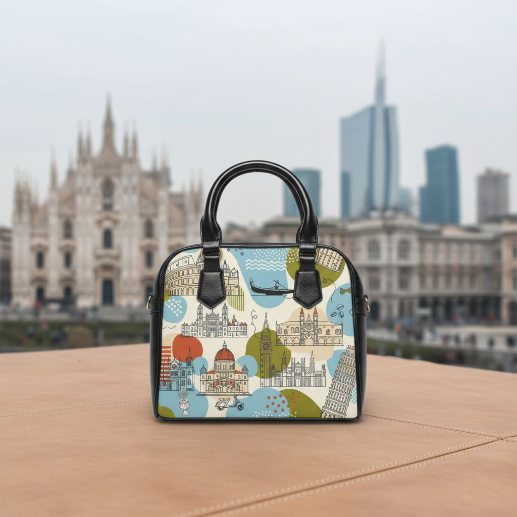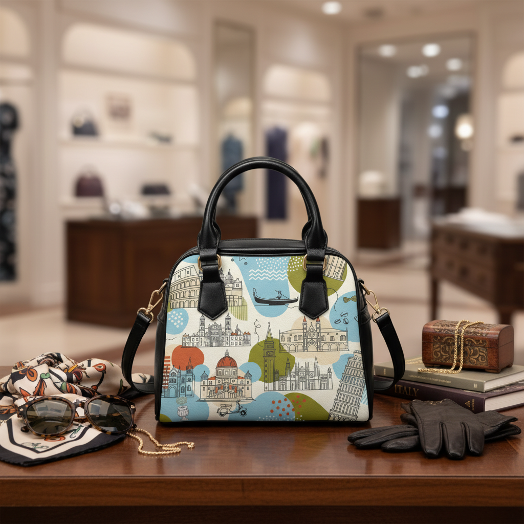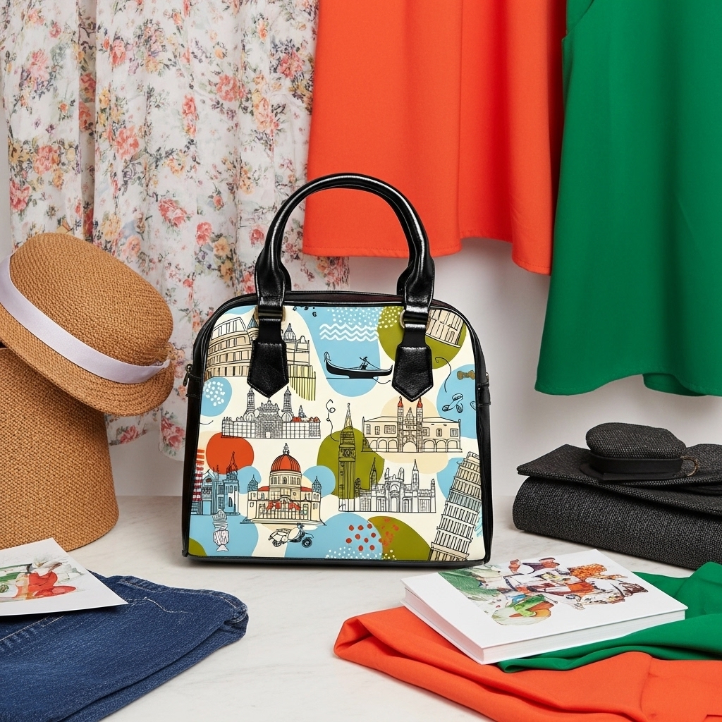 A travel-ready shoulder handbag that carries more than essentials — it carries a mood. Printed on both sides with a lively Italian architecture motif, this crossbody-style bag blends city romance with everyday practicality. The rich, crisp colors pop against black faux-leather accents and handles, giving the bag a modern, polished edge. Inside, a zip pocket and two open pockets keep passports, phone, and small notebooks organized, while a removable, adjustable PU leather shoulder strap lets you switch from hand-held to crossbody in seconds. Lightweight polyester lining and durable high-grade PU leather mean the bag looks refined while standing up to travel and daily use. Bring a slice of cobbled streets and sunlit facades into your daily routes. Product features – Double-sided vibrant print showcasing Italian architecture – High-grade 100% PU faux leather with black handles – Removable and adjustable PU leather shoulder strap – Interior zip pocket plus two open pockets for organization – Polyester lining and one-size, travel-friendly design Care instructions – Do not dryclean – Do not expose to the sun, keep in a dry place – Before cleaning the bag, remove all the items from the bag. Suggested to pretreat visible stains with stain remover. Mix warm water with laundry detergent and clean the bag with terry washcloth or soft bristle brush. Let the bag air dry.