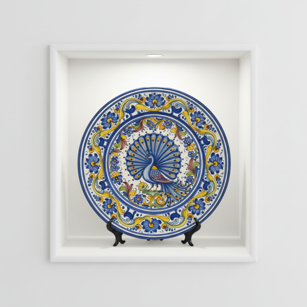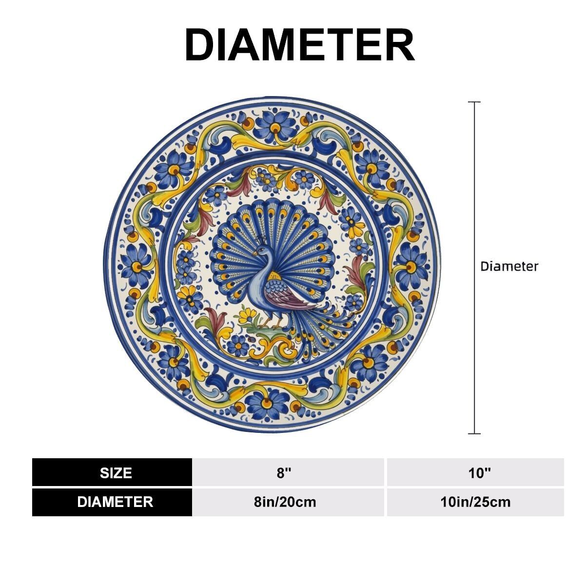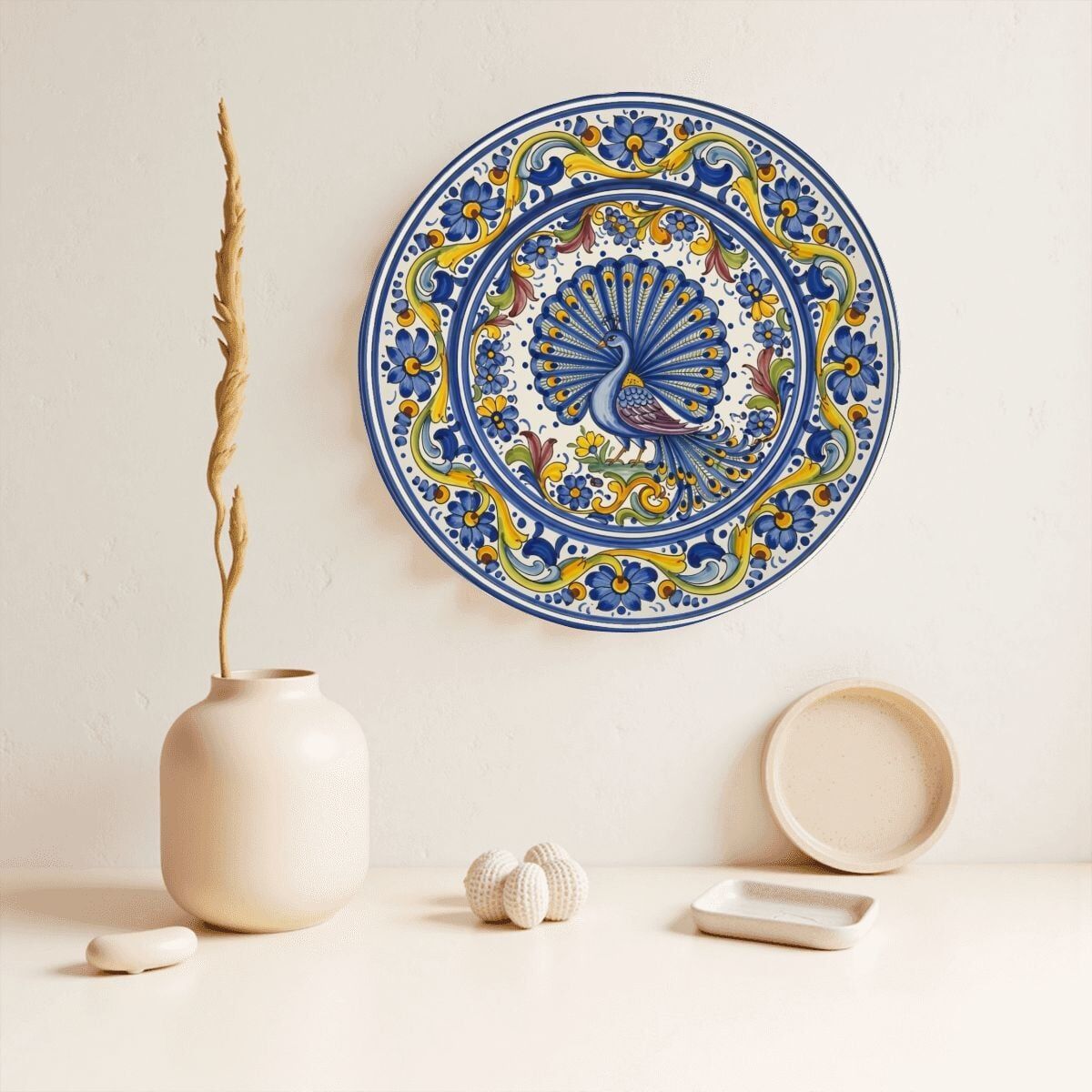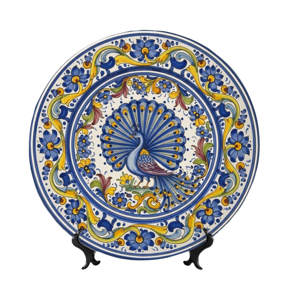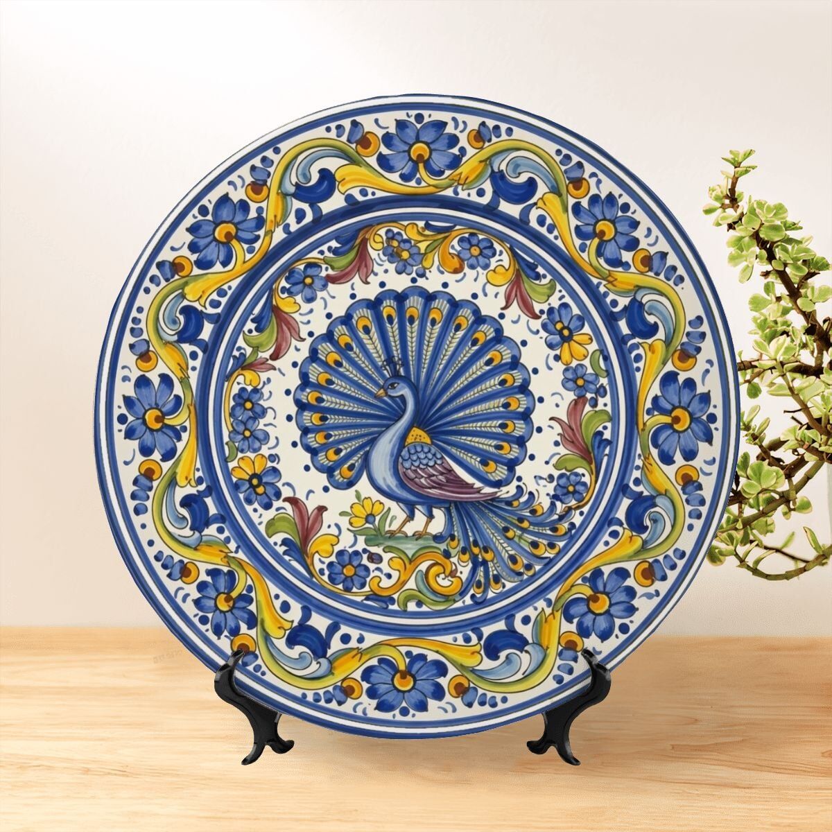 Italian Art-Inspired Blue Peacock and Floral Decorative Plate