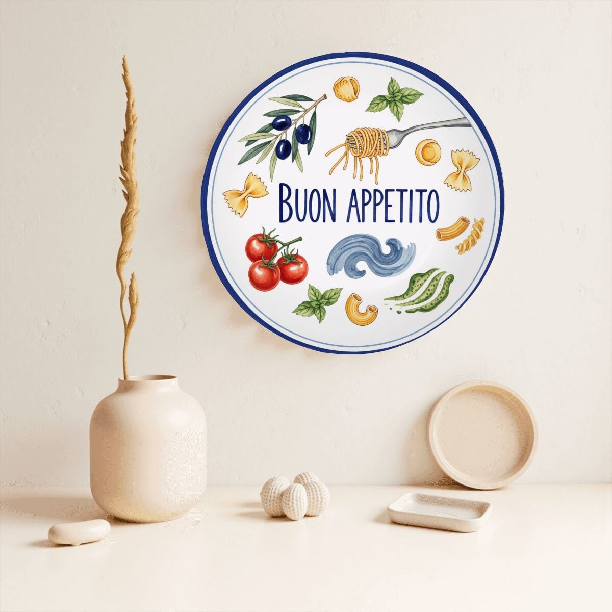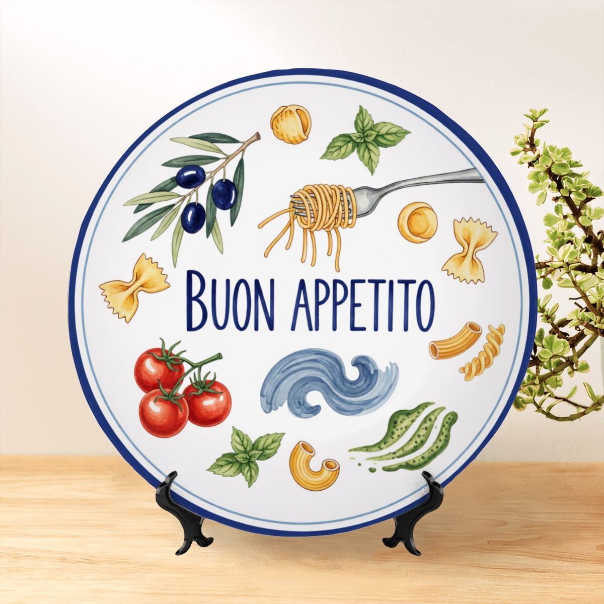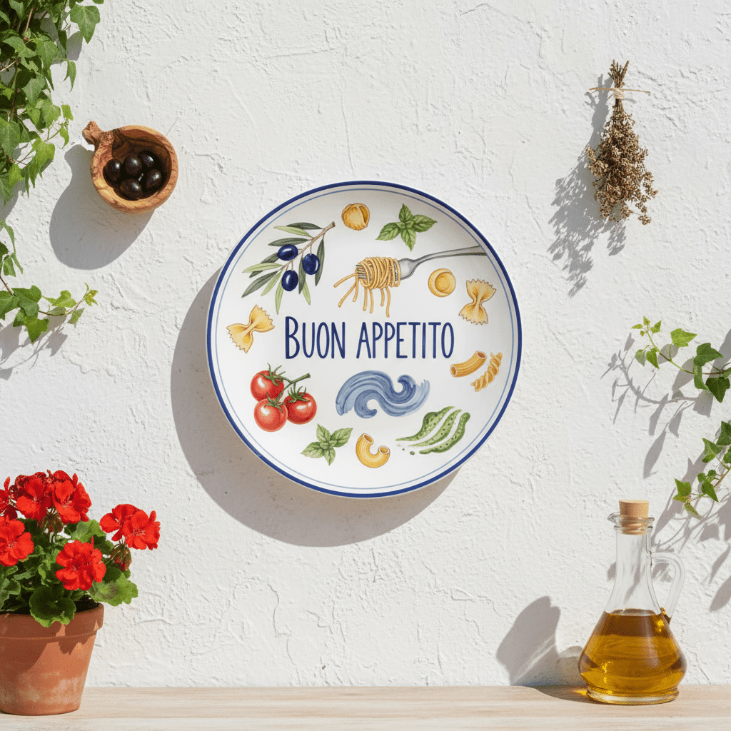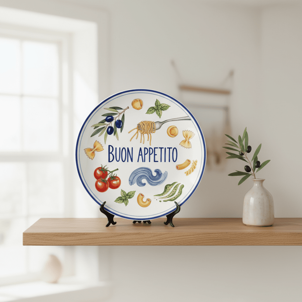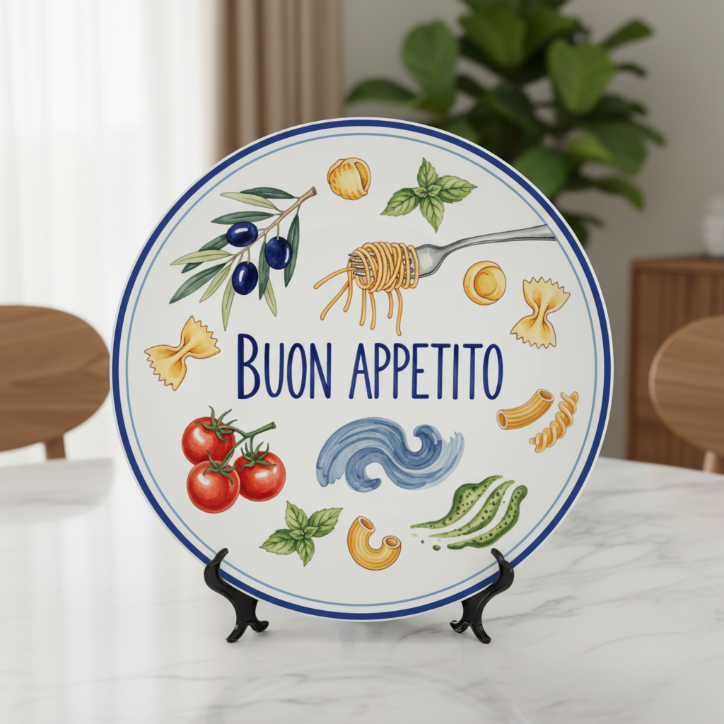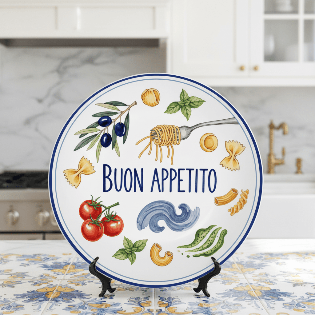This decorative plate brings the warmth of a classic Italian kitchen into your home. Inspired by traditional Mediterranean aesthetics, the design features vibrant vine-ripened tomatoes, fresh basil leaves, and assorted pasta shapes arranged artistically around the welcoming “Buon Appetito” script. Each element is rendered with a delicate watercolor-style finish that captures the charm of artisan pottery without the fragility of antique pieces. It arrives including stand for immediate display on any mantle or countertop.