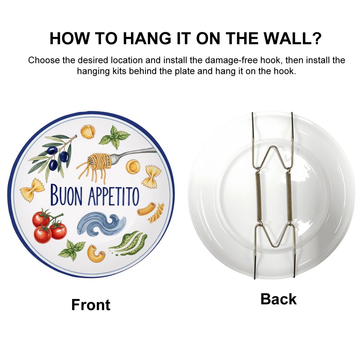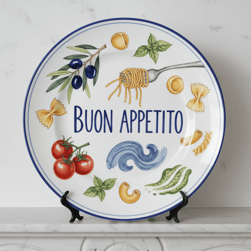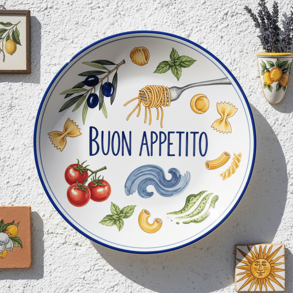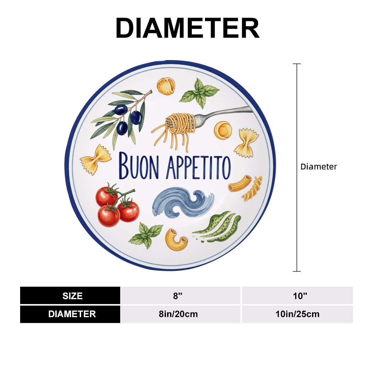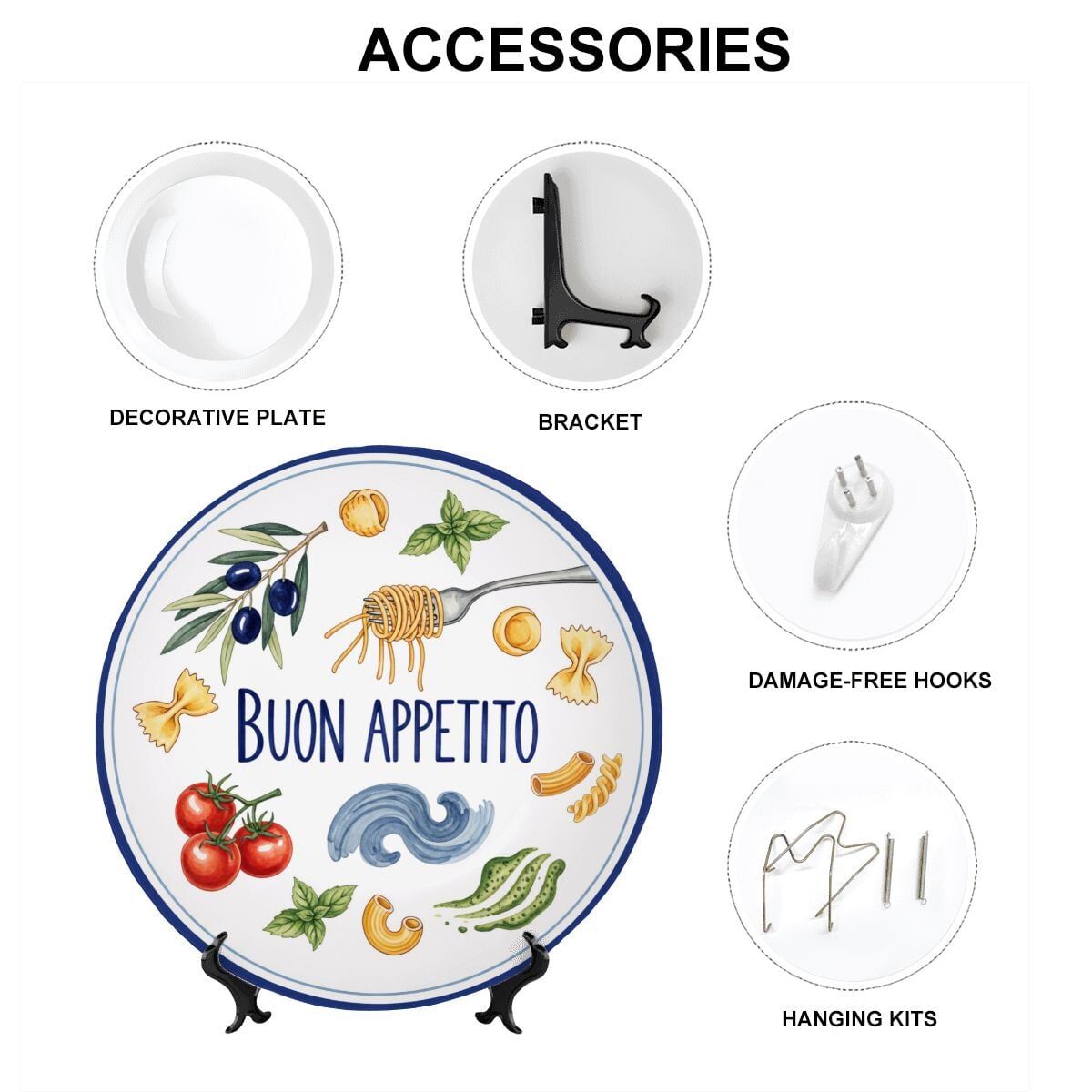 This decorative plate brings the warmth of a classic Italian kitchen into your home. Inspired by traditional Mediterranean aesthetics, the design features vibrant vine-ripened tomatoes, fresh basil leaves, and assorted pasta shapes arranged artistically around the welcoming “Buon Appetito” script. Each element is rendered with a delicate watercolor-style finish that captures the charm of artisan pottery without the fragility of antique pieces. It arrives including stand for immediate display on any mantle or countertop.
