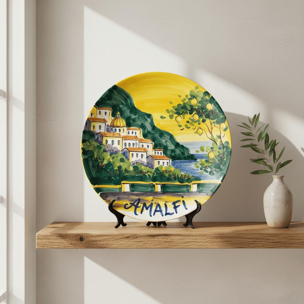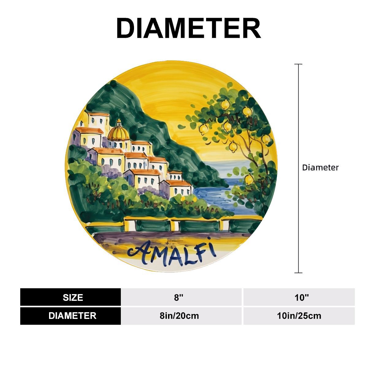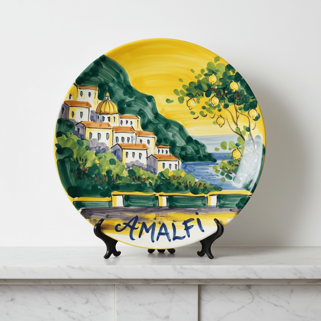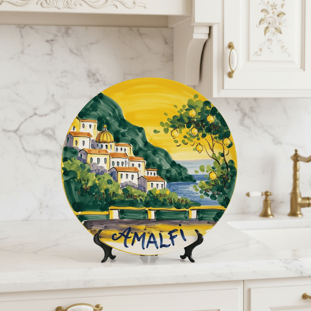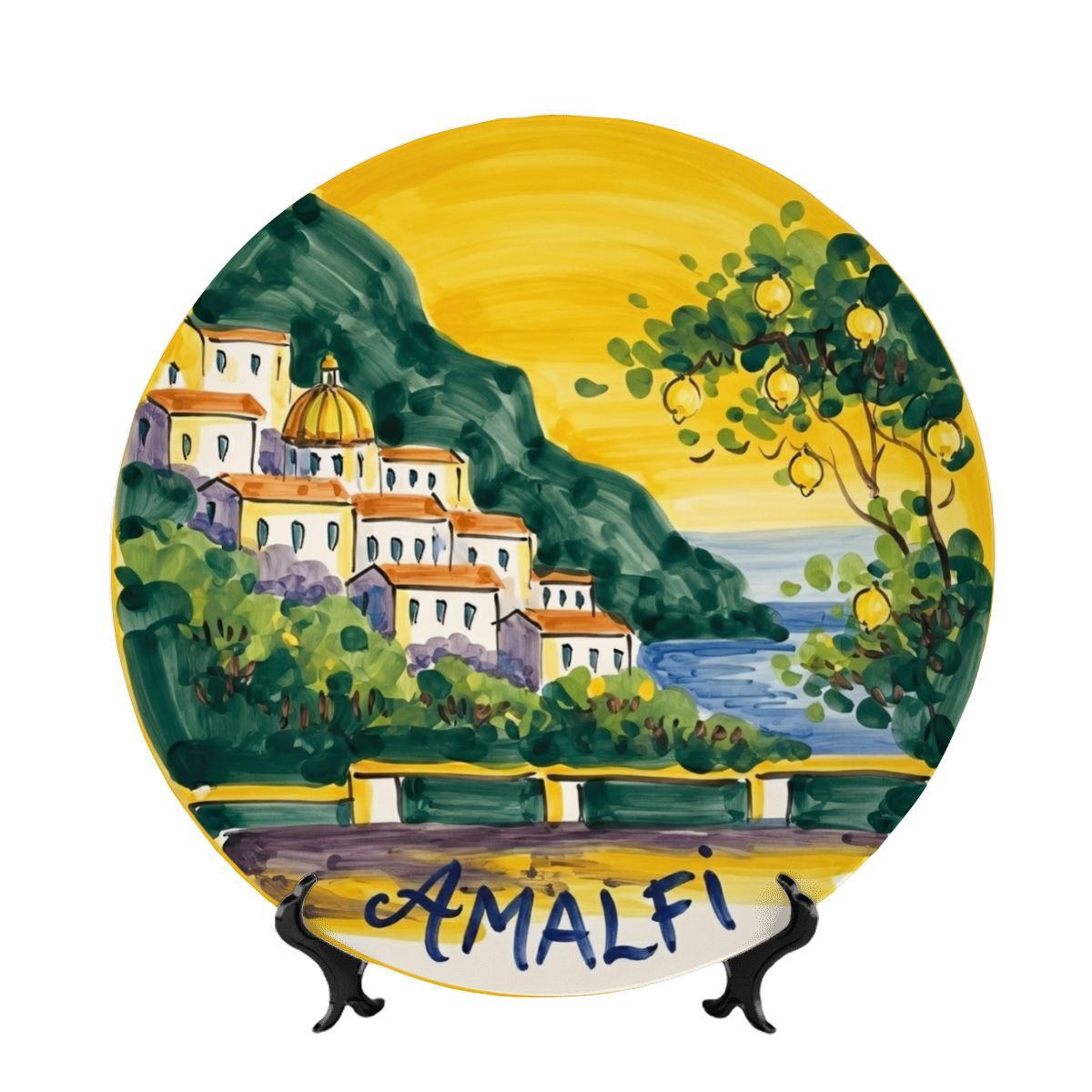 Bring the breathtaking beauty of the Italian seaside into your home with this stunning decorative piece. Inspired by the colorful cliffs of the Amalfi Coast, this plate features a picturesque town nestled against a lush green hillside under a golden sky. The inclusion of a fruitful lemon tree in the foreground adds a touch of authentic Mediterranean charm, perfect for any coastal-themed interior, and it comes complete including a stand.