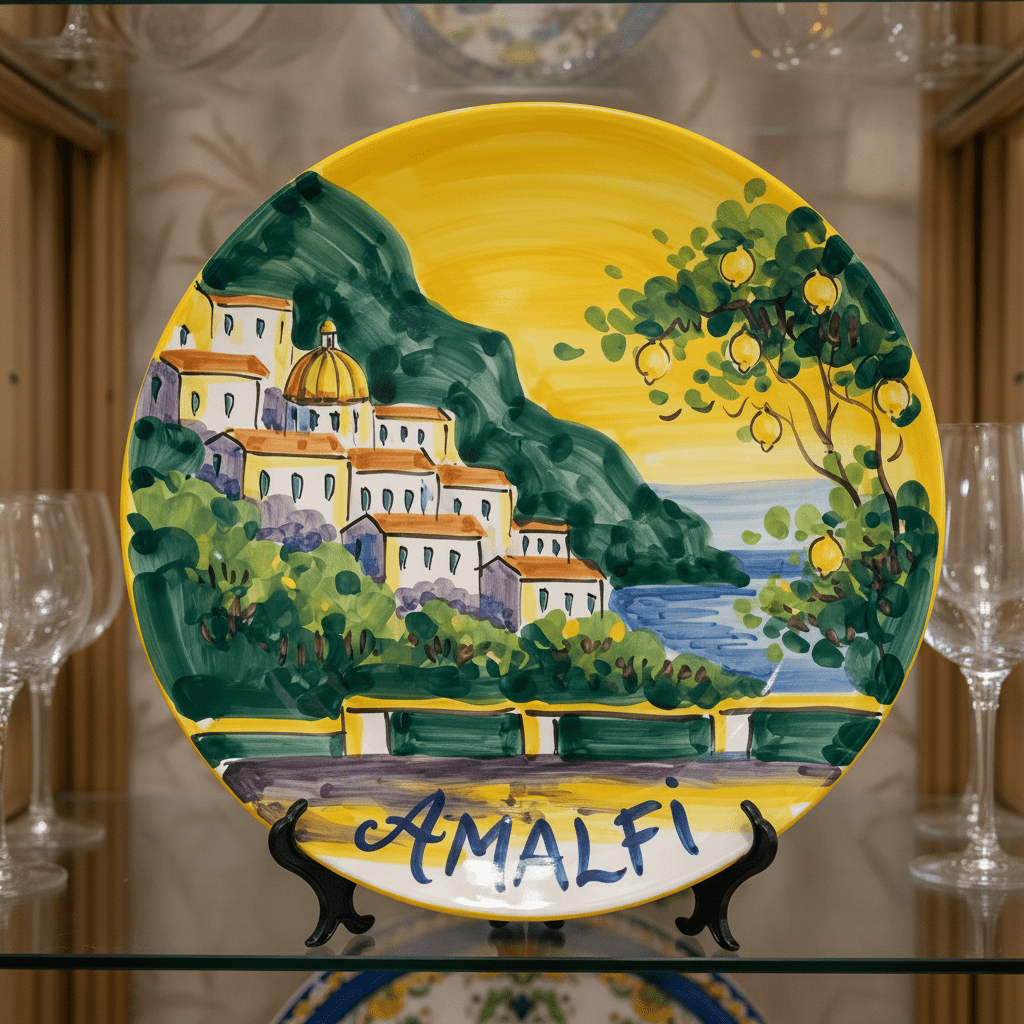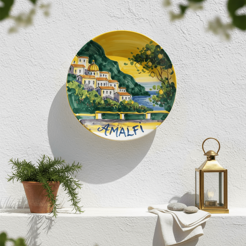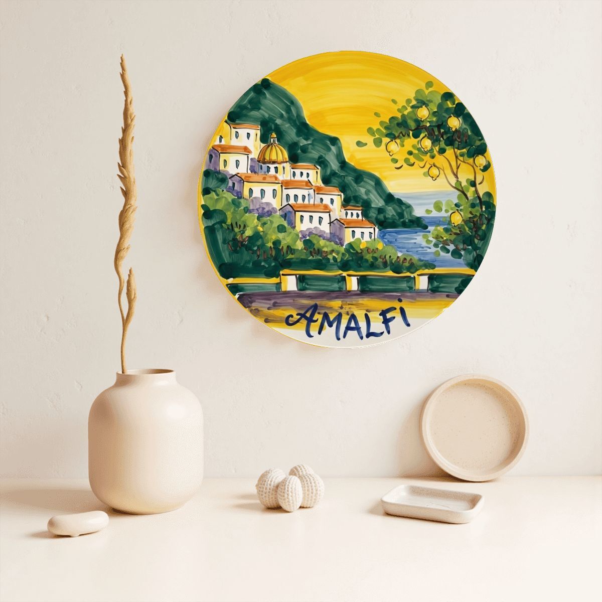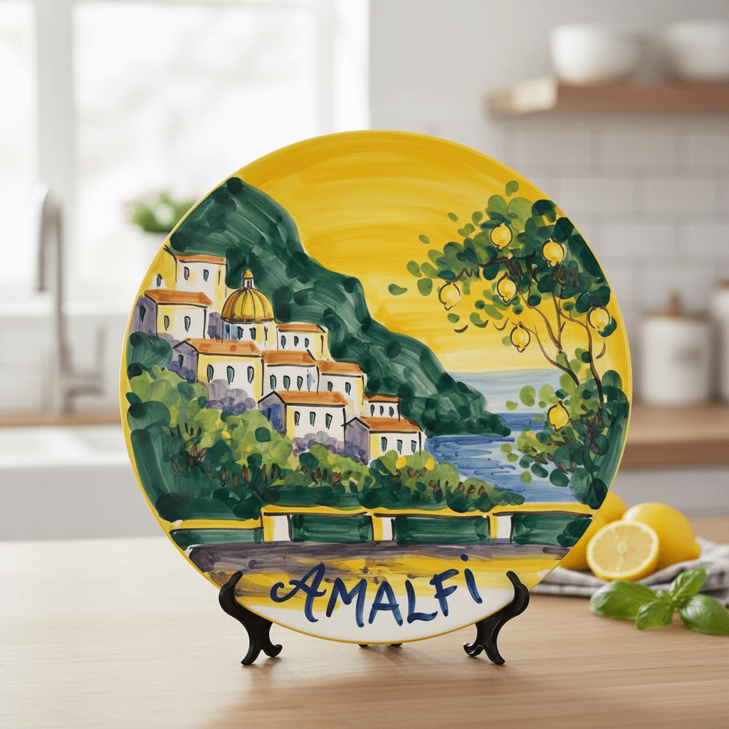 Bring the breathtaking beauty of the Italian seaside into your home with this stunning decorative piece. Inspired by the colorful cliffs of the Amalfi Coast, this plate features a picturesque town nestled against a lush green hillside under a golden sky. The inclusion of a fruitful lemon tree in the foreground adds a touch of authentic Mediterranean charm, perfect for any coastal-themed interior, and it comes complete including a stand.