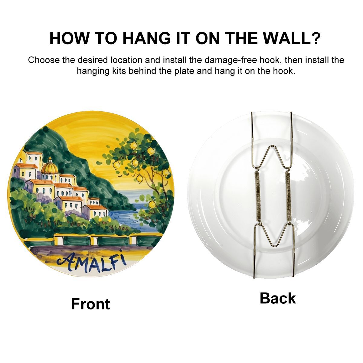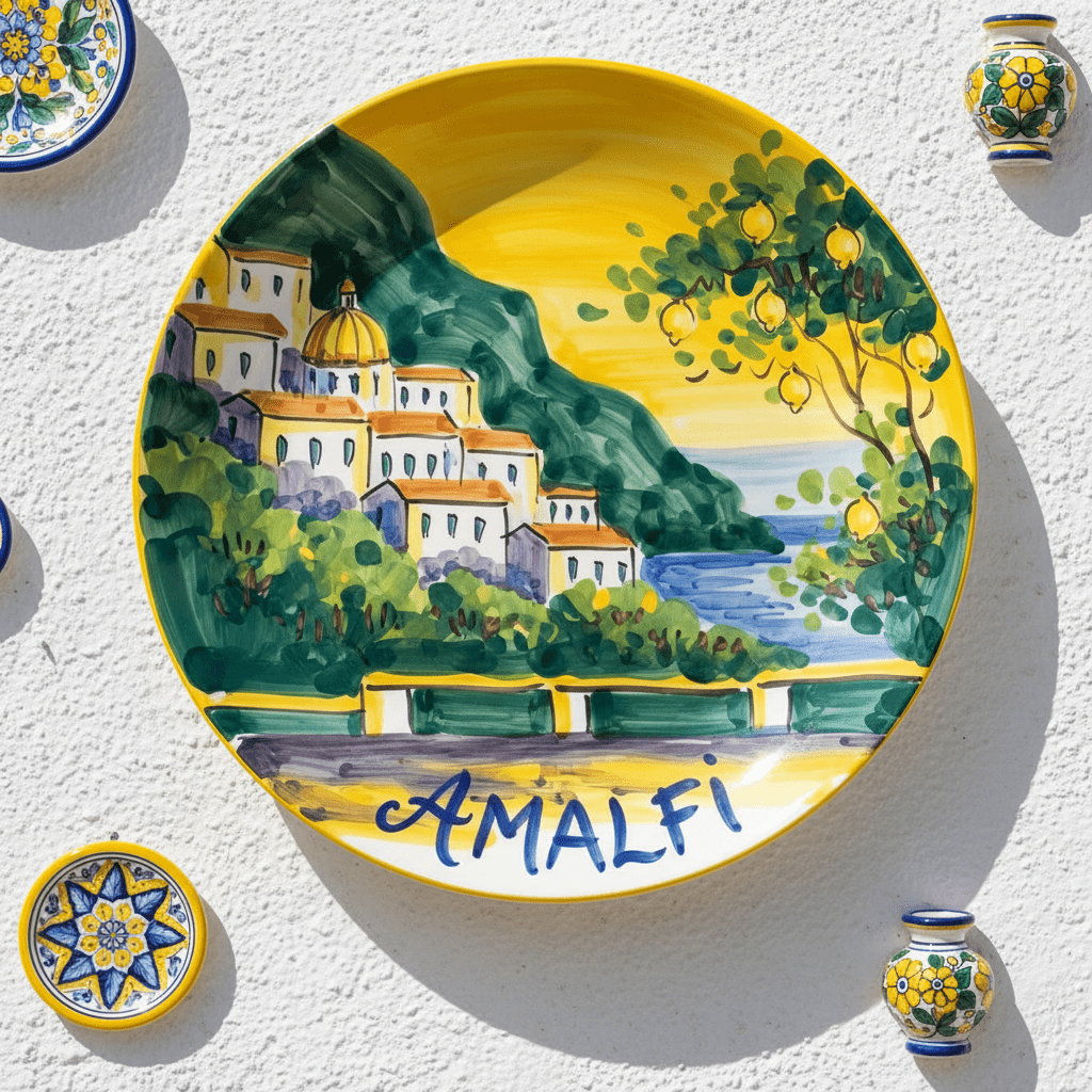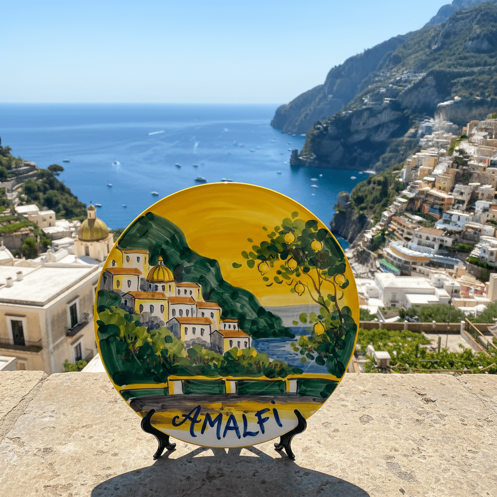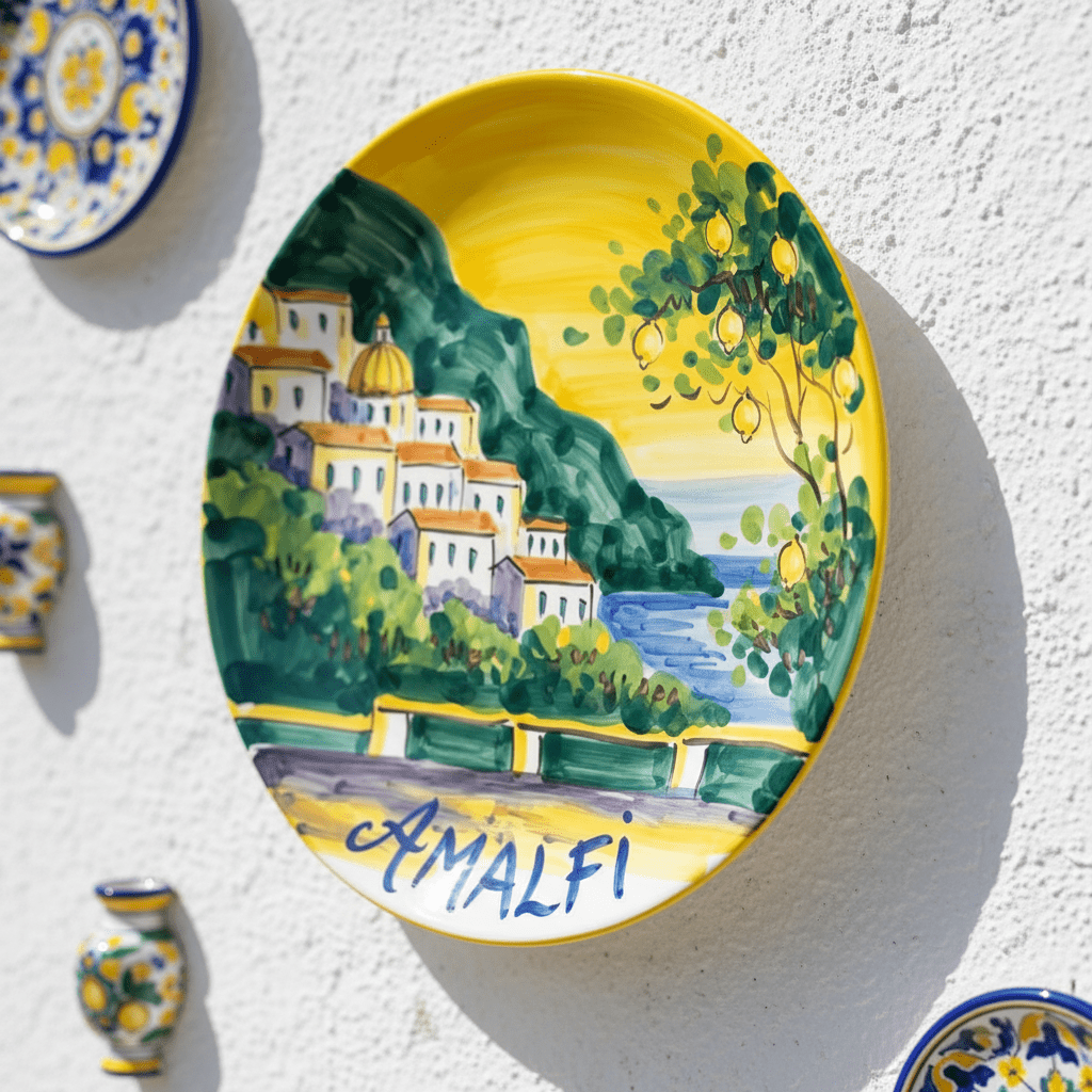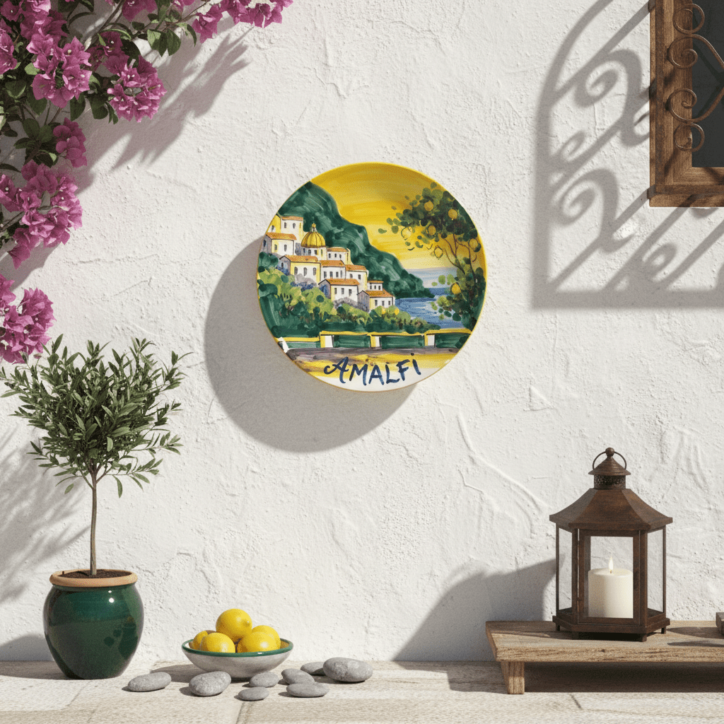 Bring the breathtaking beauty of the Italian seaside into your home with this stunning decorative piece. Inspired by the colorful cliffs of the Amalfi Coast, this plate features a picturesque town nestled against a lush green hillside under a golden sky. The inclusion of a fruitful lemon tree in the foreground adds a touch of authentic Mediterranean charm, perfect for any coastal-themed interior, and it comes complete including a stand.