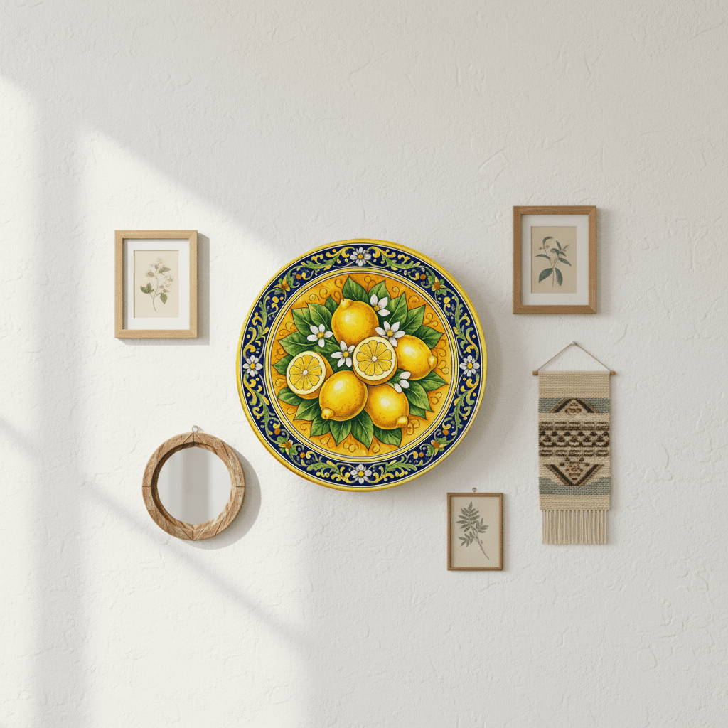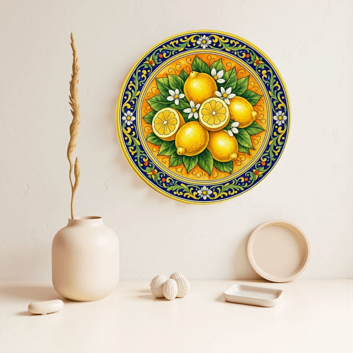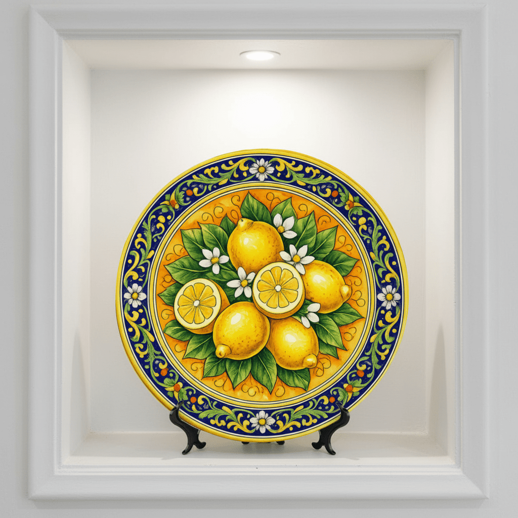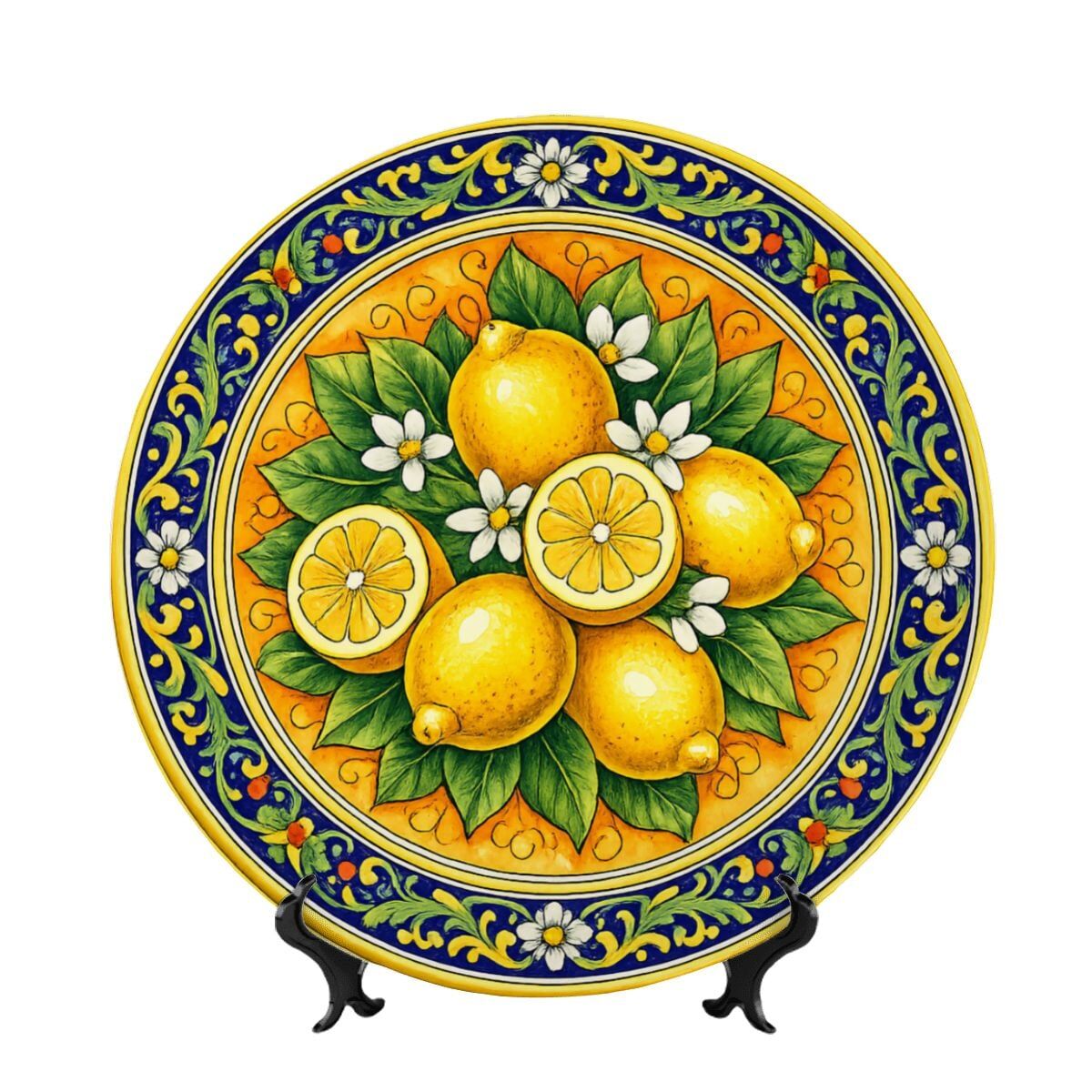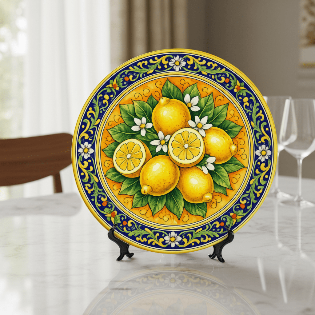 Bring the vibrant energy of a Mediterranean summer into your home with this stunning decorative plate, deeply inspired by the world-famous lemon groves of Sicily. The central artwork features a lush cluster of sun-ripened lemons and delicate white blossoms, rendered in a bold, illustrative style that captures the zest of the island. A sophisticated border of cobalt blue scrolls and yellow floral motifs frames the citrus centerpiece, reflecting the timeless beauty of traditional Italian Majolica. This ceramic display piece is finished with a high-gloss glaze that makes the colors pop, creating a radiant focal point for any kitchen, dining area, or mantelpiece.