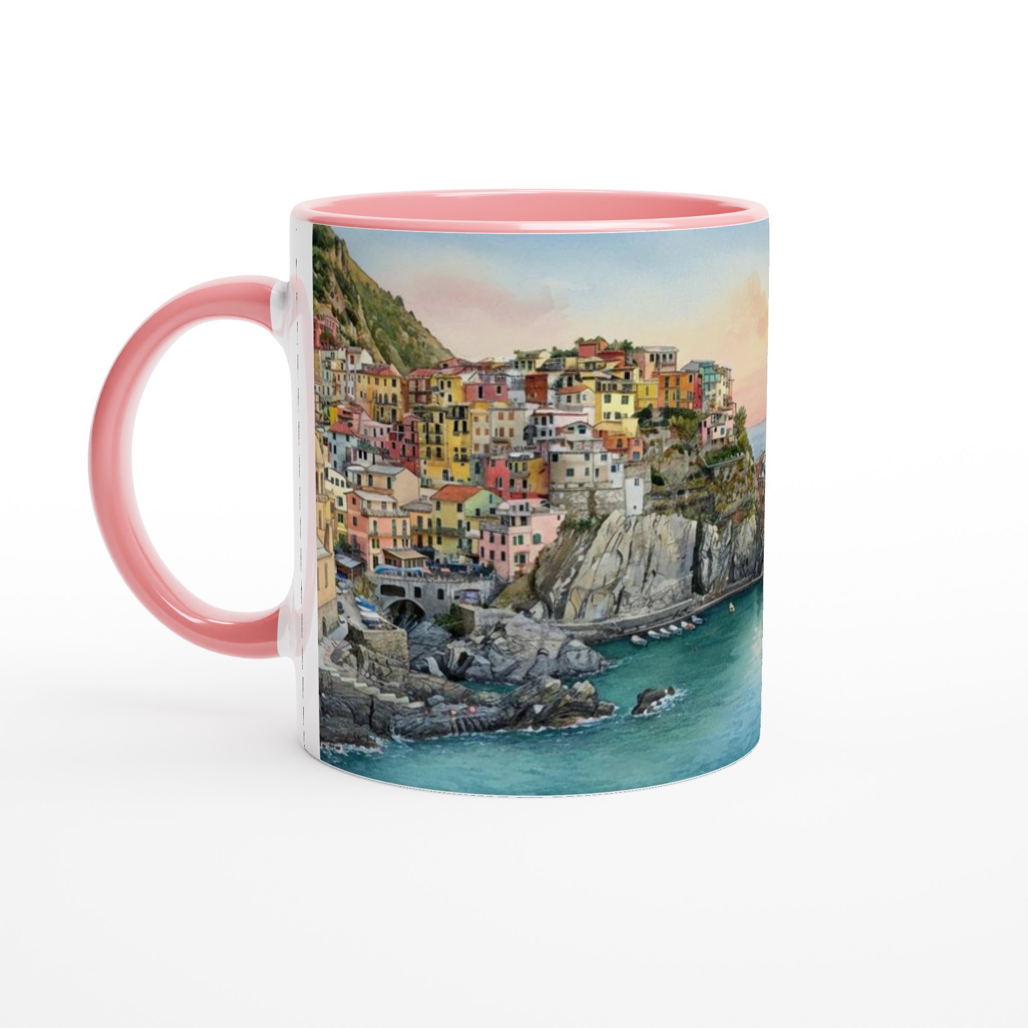 Ideal for any occasion, whether you’re cozying up with your morning coffee, indulging in hot chocolate, or enjoying a lovely afternoon tea. The mug features a glossy white finish complemented by a stylish colored rim, inside, and handle, creating a striking contrast with the colorful print.