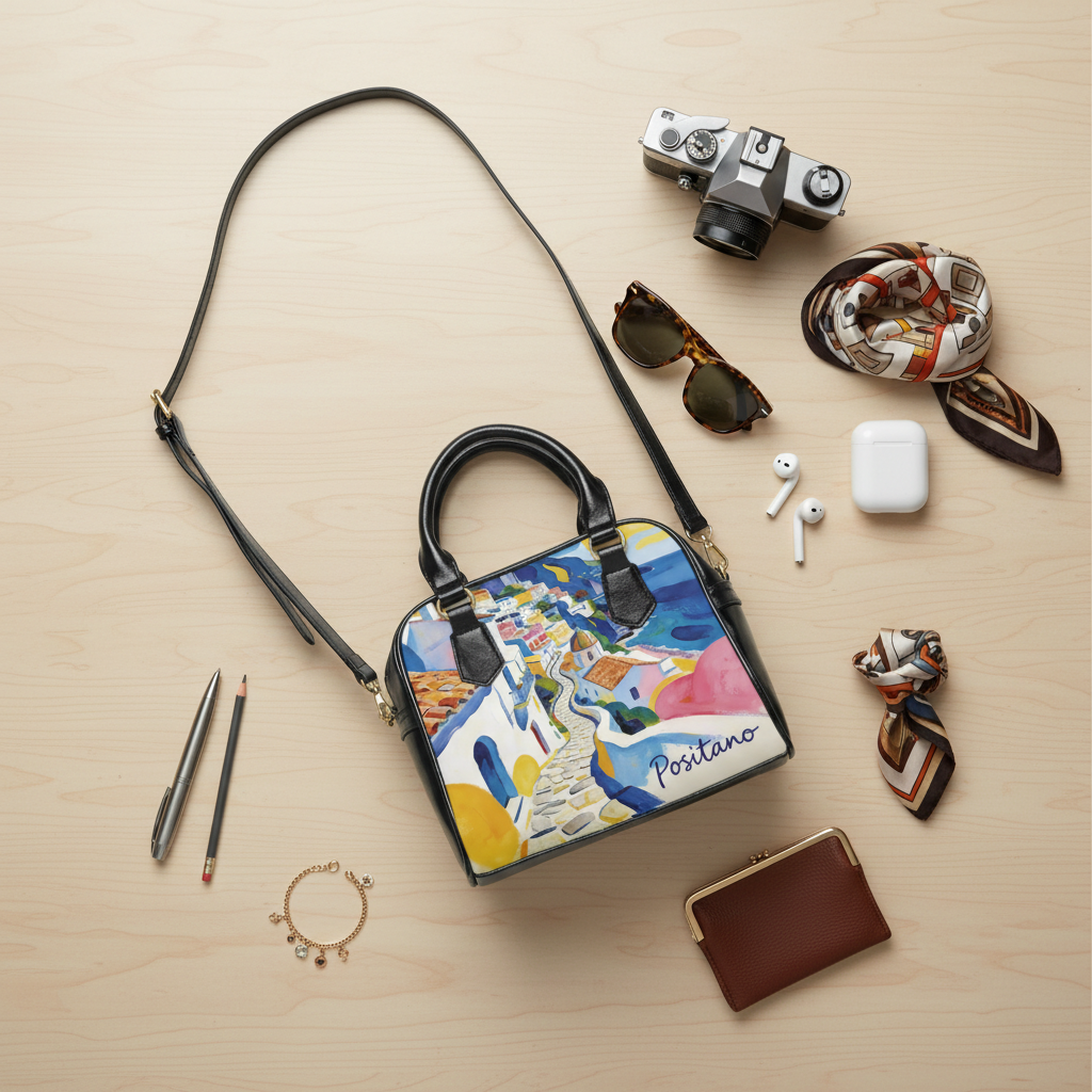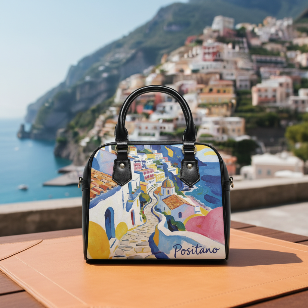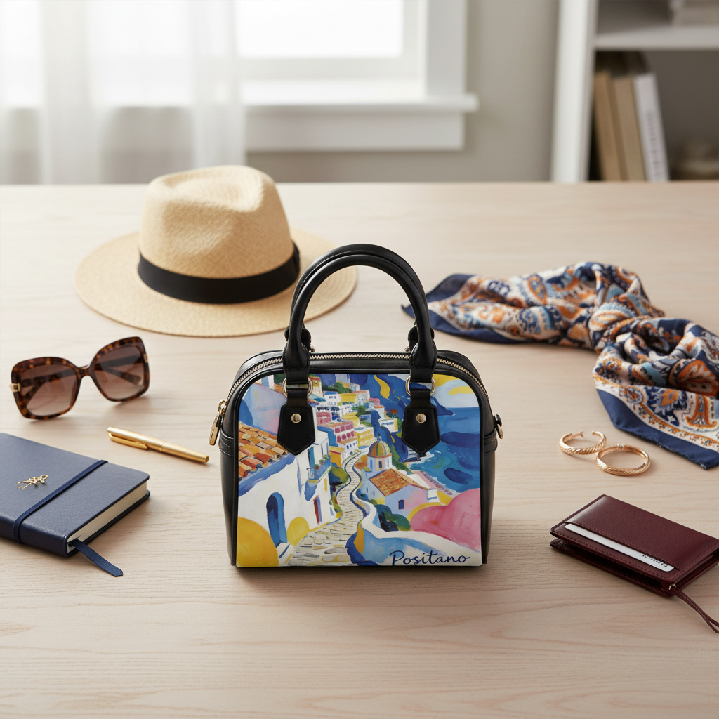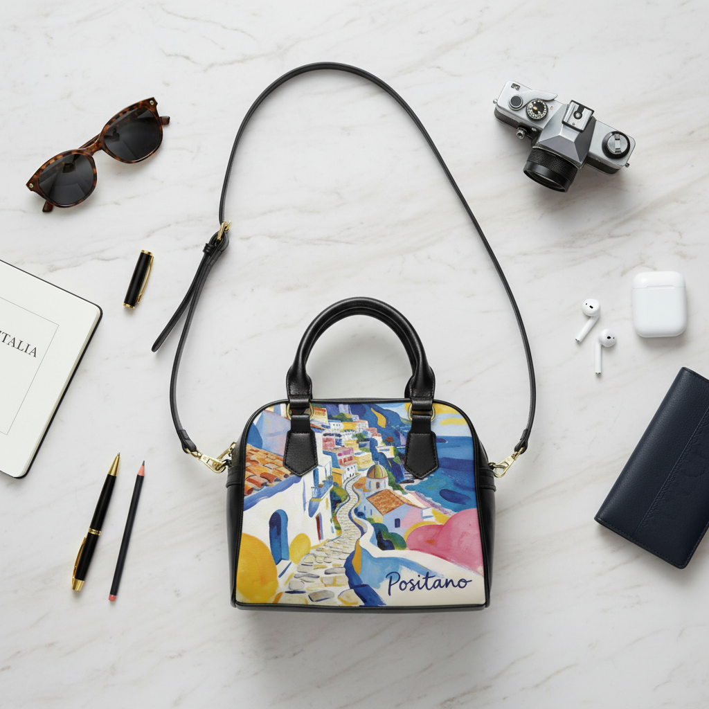 Bright, artful shoulder handbag inspired by Mediterranean coastal streets. The double-sided print captures a watercolor promenade of winding stairs, terracotta roofs and sea-blue horizons — a wearable snapshot of a sunlit afternoon in Positano. Smooth high-grade PU leather and a polished polyester lining keep the silhouette structured while remaining lightweight. Black handles and an adjustable, removable PU shoulder strap let you switch from hand-carry to crossbody in seconds. Inside, thoughtful pockets including a zippered compartment and two open pockets keep small essentials organized without digging. This bag brings color and a travel-ready mood to everyday life, slipping easily into city strolls, weekend escapes, and holiday gatherings where a touch of seaside art feels right. Product features – Vivid double-sided print using advanced printing for crisp, bright colors – High-grade 100% PU leather exterior with polyester lining – Removable and adjustable PU shoulder strap plus black top handles – Interior organization: one zippered pocket and two open pockets – One-size structured bag, lightweight and travel-friendly Care instructions – Do not dryclean – Do not expose to the sun, keep in a dry place – Before cleaning the bag, remove all the items from the bag. Suggested to pretreat visible stains with stain remover. Mix warm water with laundry detergent and clean the bag with terry washcloth or soft bristle brush. Let the bag air dry.