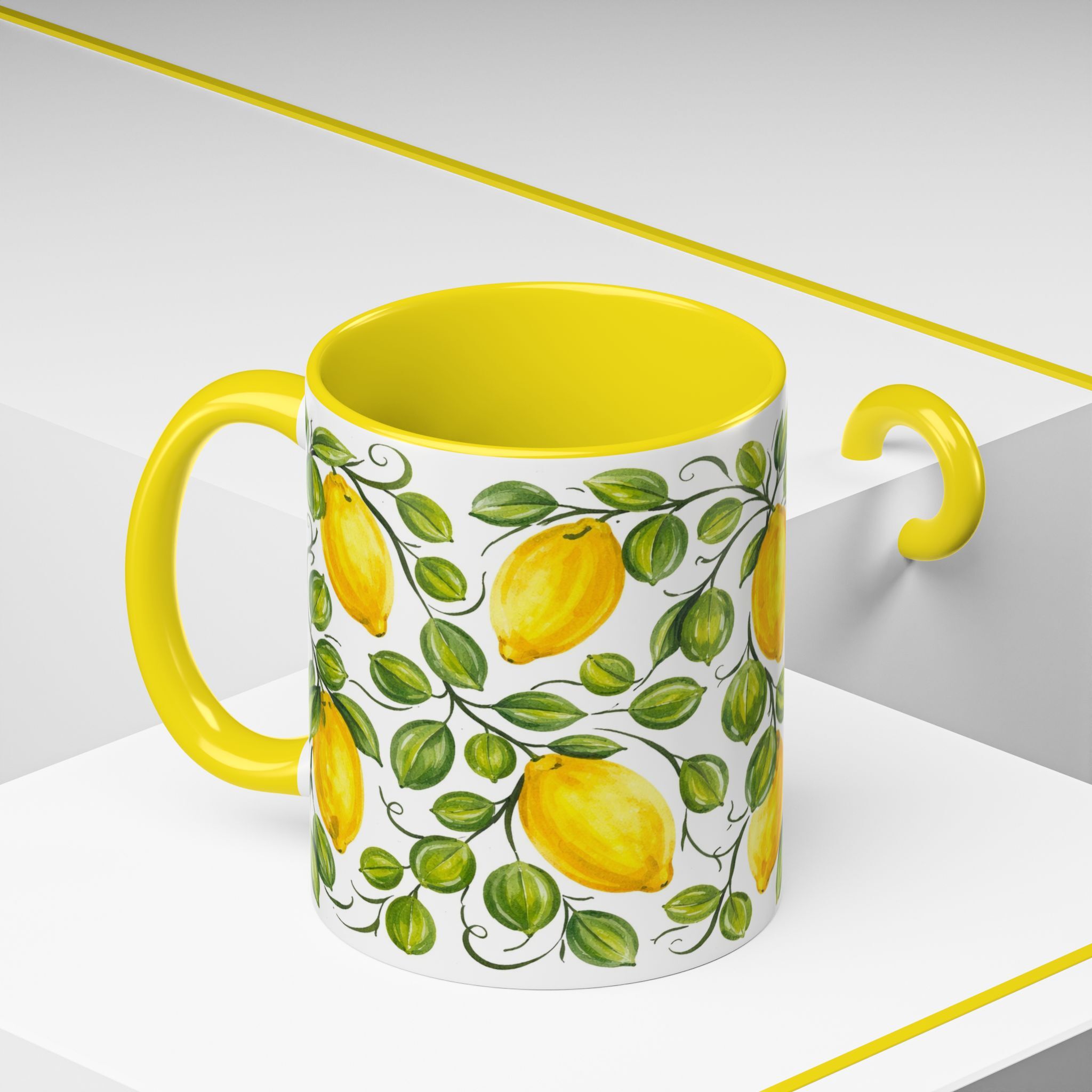 Sunlight caught in ceramic — this mug brings a little corner of Sorrento to your morning. The glossy white exterior frames a bright yellow interior, echoing Amalfi lemons and terrace views. It feels cheerful in your hands: the C-shaped handle provides a familiar grip, the weight of ceramic gives a grounded, slow-morning presence. Use it on quiet balcony breakfasts, during long work-from-home stretches, or as a sunny companion at weekend gatherings. The vibrant print and color contrast make small moments feel intentional, like a sip taken with the sea just out of sight. Product features – Microwave-safe for reheating beverages – Dishwasher-safe for easy cleaning – Available in 11oz and 15oz sizes with colored interior and handle options – Glossy white ceramic with vibrant, color-accurate printing – Lead- and BPA-free, C-shaped handle for comfortable grip Care instructions – Clean in dishwasher or wash by hand with warm water and dish soap EU representative: HONSON VENTURES LIMITED, gpsr@honsonventures.com, 3, Gnaftis House flat 102, Limassol, Mesa Geitonia, 4003, CY Product information: Generic brand, 2 year warranty in EU and Northern Ireland as per Directive 1999/44/EC Warnings, Hazard: Blank product sourced from China Care instructions: Clean in dishwasher or wash by hand with warm water and dish soap