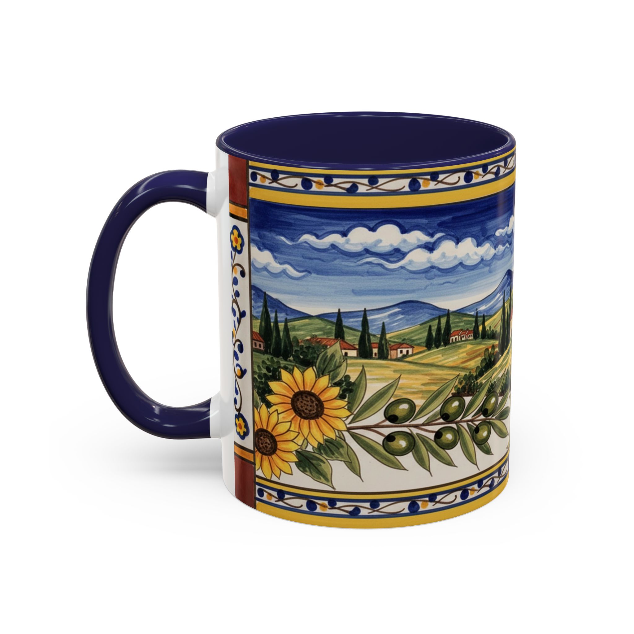 Bright ceramic mug that brings a sunlit Tuscan morning to your kitchen. Hand-painted style sunflowers, olive branches, rolling hills and cypress-lined horizons wrap the mug in a lively, rustic scene. The colored interior and handle add a bold contrast against the glossy white exterior, so every sip feels warm and thoughtfully styled. Sturdy C-handle and two size options make it easy to choose the right cup for slow mornings or a larger afternoon pick-me-up.