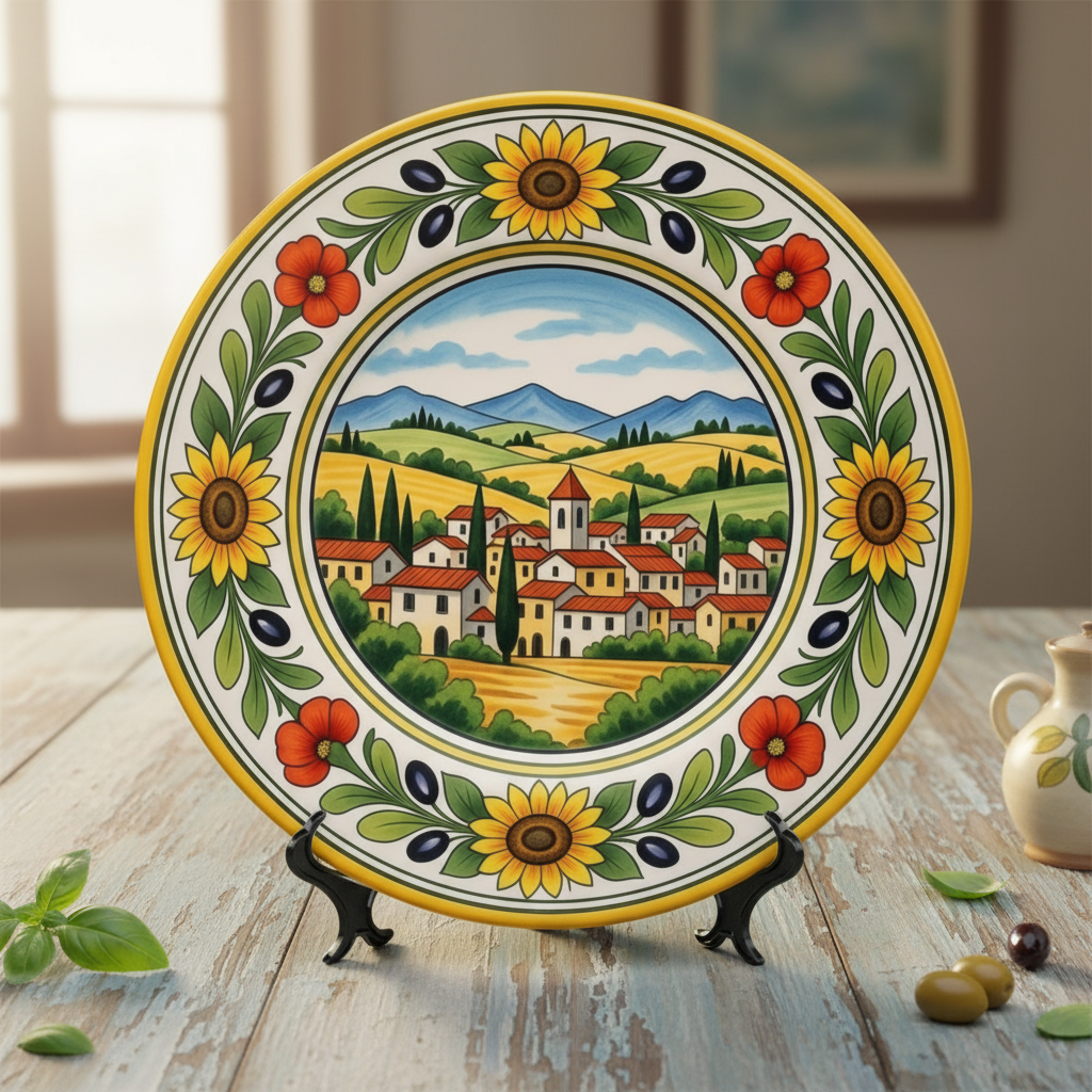Tuscan Village Landscape Ceramic Platter with Olive Branch and Floral Rim Design