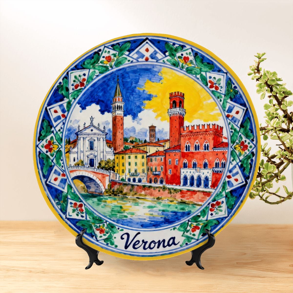 Verona Cityscape Heritage Plate: Capture the timeless beauty of Italy with this stunning decorative ceramic plate, featuring an ornate Renaissance border.